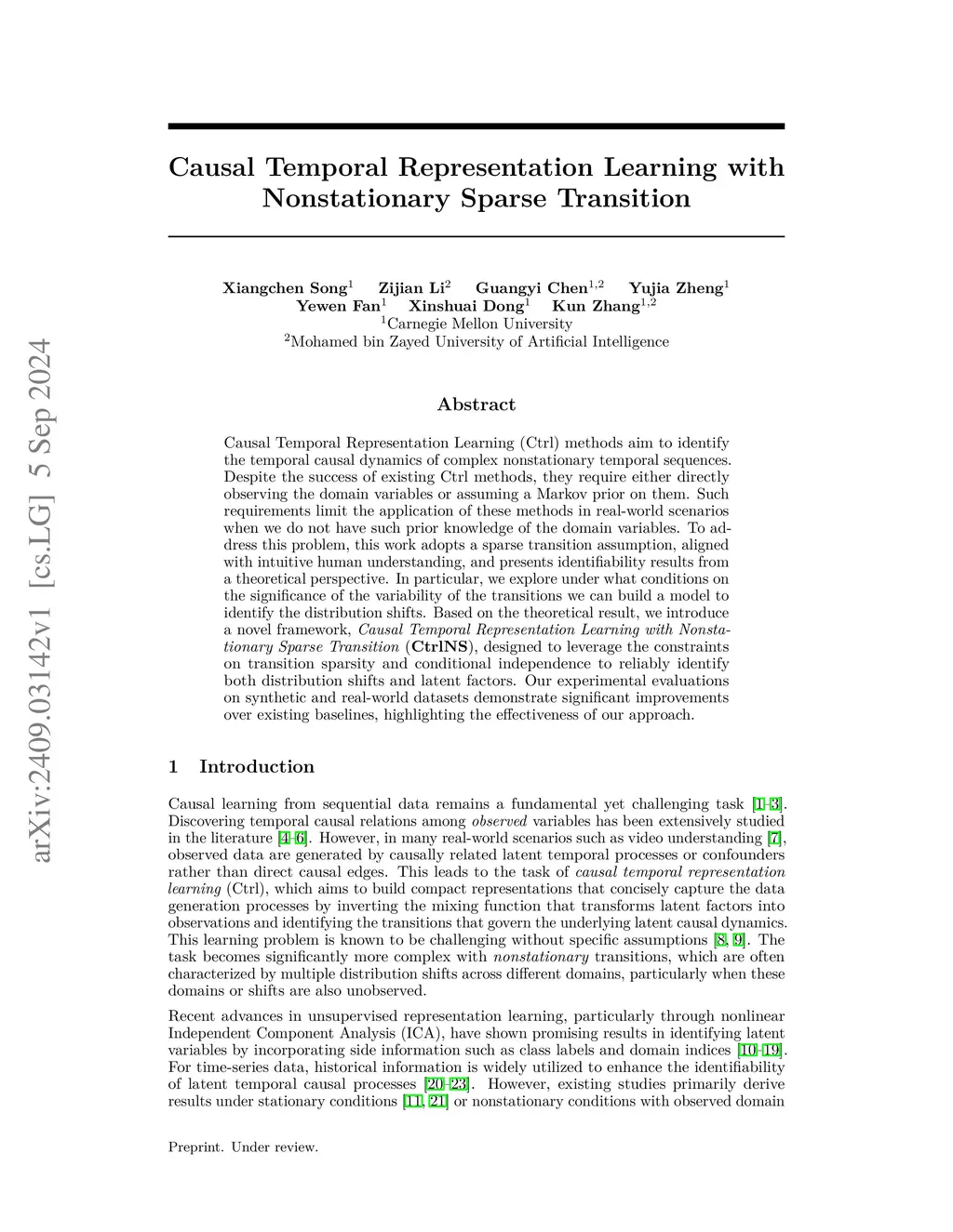 Causal Temporal Representation Learning (Ctrl) methods aim to identify the temporal causal dynamics of complex nonstationary temporal sequences. Despite the success of existing Ctrl methods, they require either directly observing the domain variables or assuming a Markov prior on them. Such requirements limit the application of these methods in real-world scenarios when we do not have such prior knowledge of the domain variables. To address this problem, this work adopts a sparse transition assumption, aligned with intuitive human understanding, and presents identifiability results from a theoretical perspective. In particular, we explore under what conditions on the significance of the variability of the transitions we can build a model to identify the distribution shifts. Based on the theoretical result, we introduce a novel framework, Causal Temporal Representation Learning with Nonstationary Sparse Transition (CtrlNS), designed to leverage the constraints on transition sparsity and conditional independence to reliably identify both distribution shifts and latent factors. Our experimental evaluations on synthetic and real-world datasets demonstrate significant improvements over existing baselines, highlighting the effectiveness of our approach.