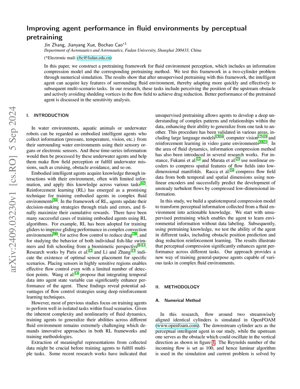 In this paper, we construct a pretraining framework for fluid environment perception, which includes an information compression model and the corresponding pretraining method. We test this framework in a two-cylinder problem through numerical simulation. The results show that after unsupervised pretraining with this framework, the intelligent agent can acquire key features of surrounding fluid environment, thereby adapting more quickly and effectively to subsequent multi-scenario tasks. In our research, these tasks include perceiving the position of the upstream obstacle and actively avoiding shedding vortices in the flow field to achieve drag reduction. Better performance of the pretrained agent is discussed in the sensitivity analysis.