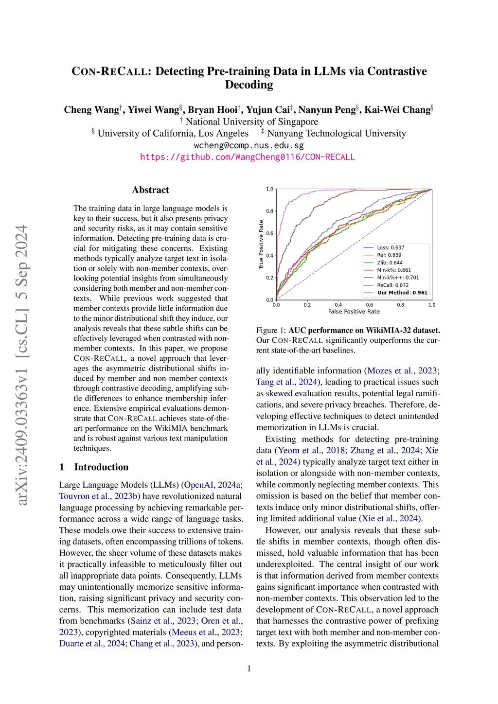 The training data in large language models is key to their success, but it also presents privacy and security risks, as it may contain sensitive information. Detecting pre-training data is crucial for mitigating these concerns. Existing methods typically analyze target text in isolation or solely with non-member contexts, overlooking potential insights from simultaneously considering both member and non-member contexts. While previous work suggested that member contexts provide little information due to the minor distributional shift they induce, our analysis reveals that these subtle shifts can be effectively leveraged when contrasted with non-member contexts. In this paper, we propose Con-ReCall, a novel approach that leverages the asymmetric distributional shifts induced by member and non-member contexts through contrastive decoding, amplifying subtle differences to enhance membership inference. Extensive empirical evaluations demonstrate that Con-ReCall achieves state-of-the-art performance on the WikiMIA benchmark and is robust against various text manipulation techniques.