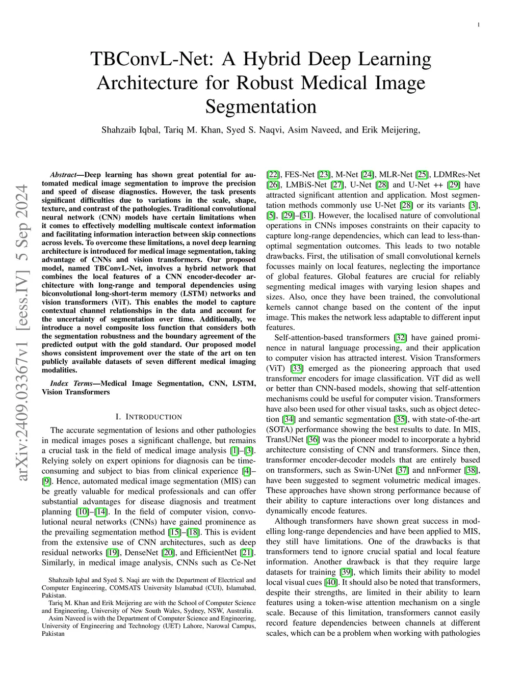 Deep learning has shown great potential for automated medical image segmentation to improve the precision and speed of disease diagnostics. However, the task presents significant difficulties due to variations in the scale, shape, texture, and contrast of the pathologies. Traditional convolutional neural network (CNN) models have certain limitations when it comes to effectively modelling multiscale context information and facilitating information interaction between skip connections across levels. To overcome these limitations, a novel deep learning architecture is introduced for medical image segmentation, taking advantage of CNNs and vision transformers. Our proposed model, named TBConvL-Net, involves a hybrid network that combines the local features of a CNN encoder-decoder architecture with long-range and temporal dependencies using biconvolutional long-short-term memory (LSTM) networks and vision transformers (ViT). This enables the model to capture contextual channel relationships in the data and account for the uncertainty of segmentation over time. Additionally, we introduce a novel composite loss function that considers both the segmentation robustness and the boundary agreement of the predicted output with the gold standard. Our proposed model shows consistent improvement over the state of the art on ten publicly available datasets of seven different medical imaging modalities.