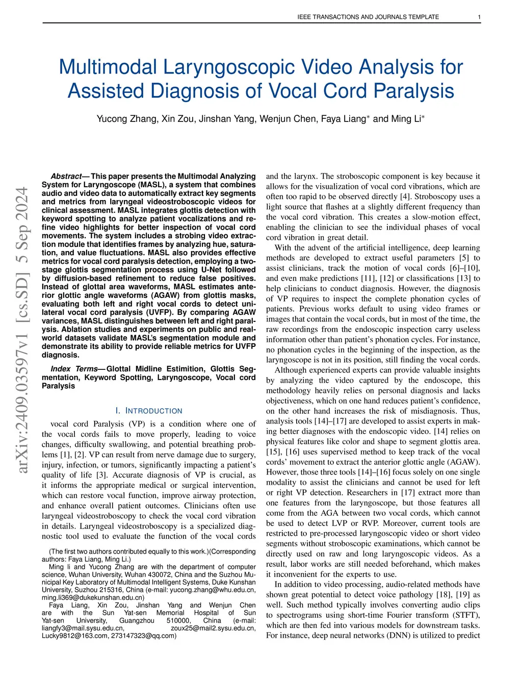 Multimodal Laryngoscopic Video Analysis for Assisted Diagnosis of Vocal Fold Paralysis