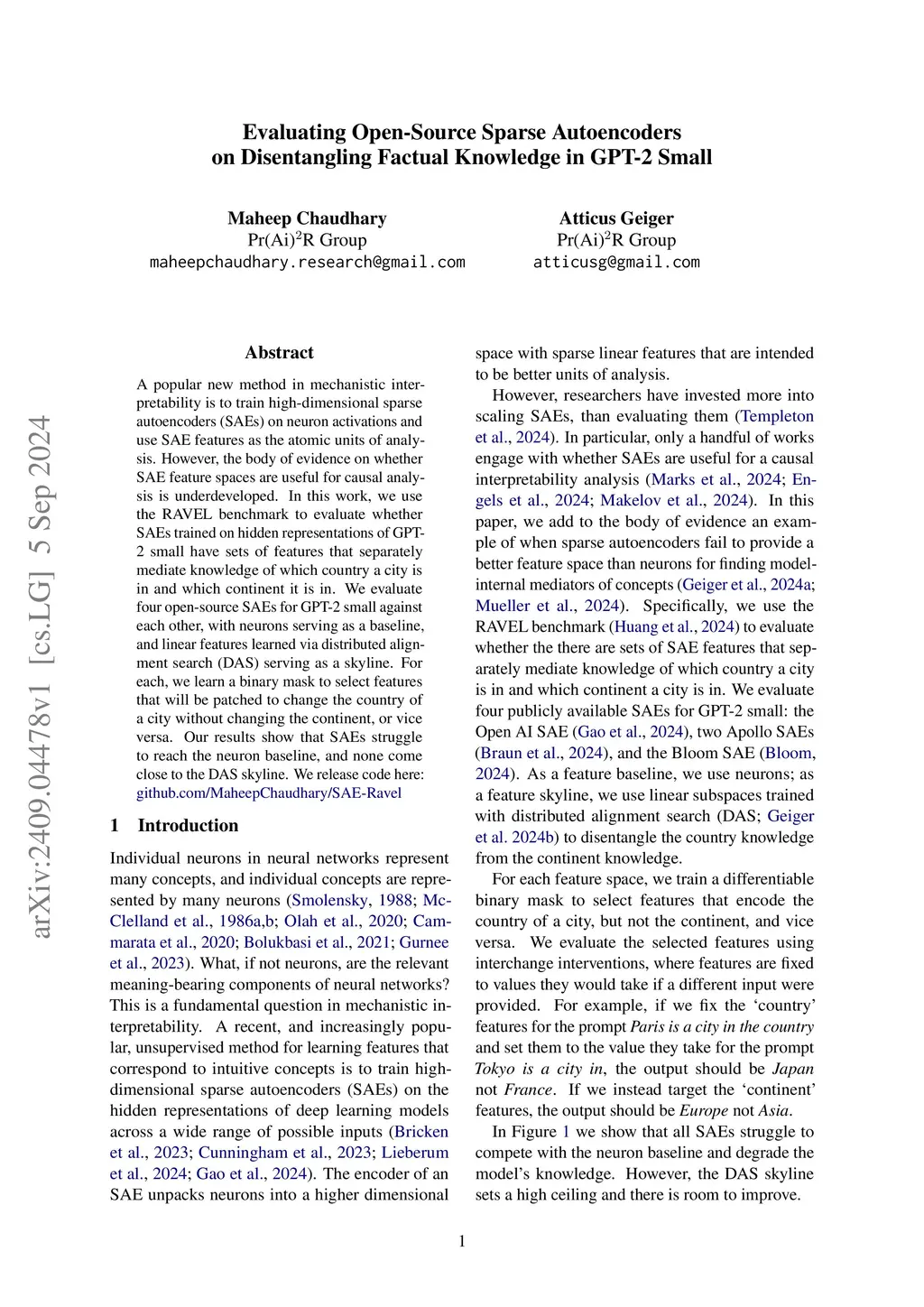 A popular new method in mechanistic interpretability is to train high-dimensional sparse autoencoders (SAEs) on neuron activations and use SAE features as the atomic units of analysis. However, the body of evidence on whether SAE feature spaces are useful for causal analysis is underdeveloped. In this work, we use the RAVEL benchmark to evaluate whether SAEs trained on hidden representations of GPT-2 small have sets of features that separately mediate knowledge of which country a city is in and which continent it is in. We evaluate four open-source SAEs for GPT-2 small against each other, with neurons serving as a baseline, and linear features learned via distributed alignment search (DAS) serving as a skyline. For each, we learn a binary mask to select features that will be patched to change the country of a city without changing the continent, or vice versa. Our results show that SAEs struggle to reach the neuron baseline, and none come close to the DAS skyline. We release code here: https://github.com/MaheepChaudhary/SAE-Ravel