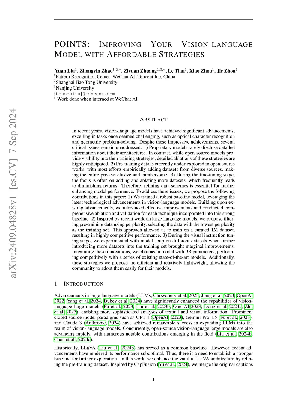 In recent years, vision-language models have made significant strides, excelling in tasks like optical character recognition and geometric problem-solving. However, several critical issues remain: 1) Proprietary models often lack transparency about their architectures, while open-source models need more detailed ablations of their training strategies. 2) Pre-training data in open-source works is under-explored, with datasets added empirically, making the process cumbersome. 3) Fine-tuning often focuses on adding datasets, leading to diminishing returns. To address these issues, we propose the following contributions: 1) We trained a robust baseline model using the latest advancements in vision-language models, introducing effective improvements and conducting comprehensive ablation and validation for each technique. 2) Inspired by recent work on large language models, we filtered pre-training data using perplexity, selecting the lowest perplexity data for training. This approach allowed us to train on a curated 1M dataset, achieving competitive performance. 3) During visual instruction tuning, we used model soup on different datasets when adding more datasets yielded marginal improvements. These innovations resulted in a 9B parameter model that performs competitively with state-of-the-art models. Our strategies are efficient and lightweight, making them easily adoptable by the community.