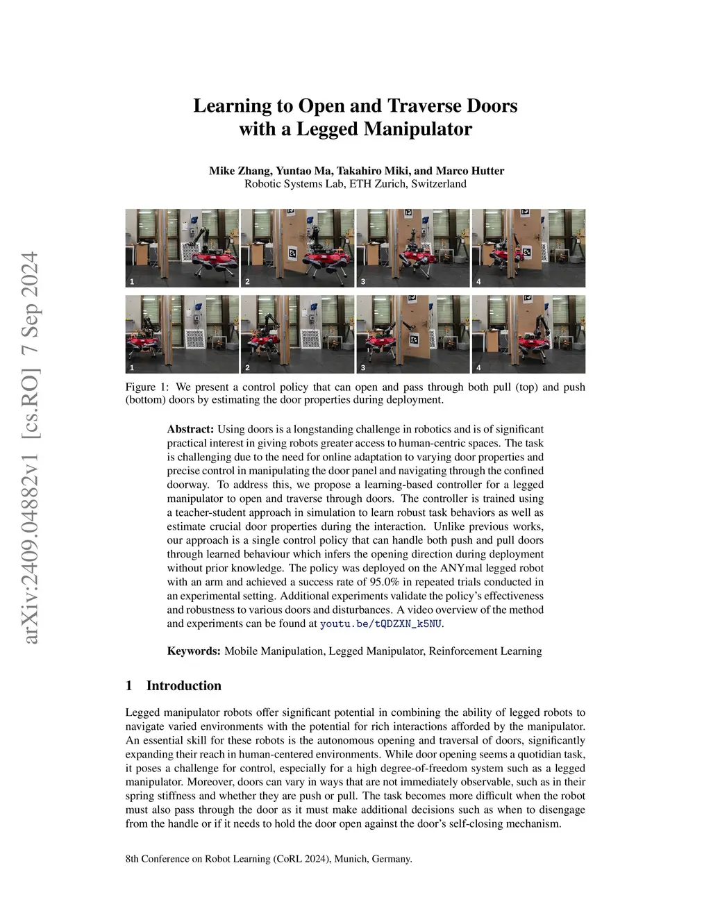 Using doors is a longstanding challenge in robotics and is of significant practical interest in giving robots greater access to human-centric spaces. The task is challenging due to the need for online adaptation to varying door properties and precise control in manipulating the door panel and navigating through the confined doorway. To address this, we propose a learning-based controller for a legged manipulator to open and traverse through doors. The controller is trained using a teacher-student approach in simulation to learn robust task behaviors as well as estimate crucial door properties during the interaction. Unlike previous works, our approach is a single control policy that can handle both push and pull doors through learned behaviour which infers the opening direction during deployment without prior knowledge. The policy was deployed on the ANYmal legged robot with an arm and achieved a success rate of 95.0% in repeated trials conducted in an experimental setting. Additional experiments validate the policy's effectiveness and robustness to various doors and disturbances. A video overview of the method and experiments can be found at youtu.be/tQDZXN_k5NU.