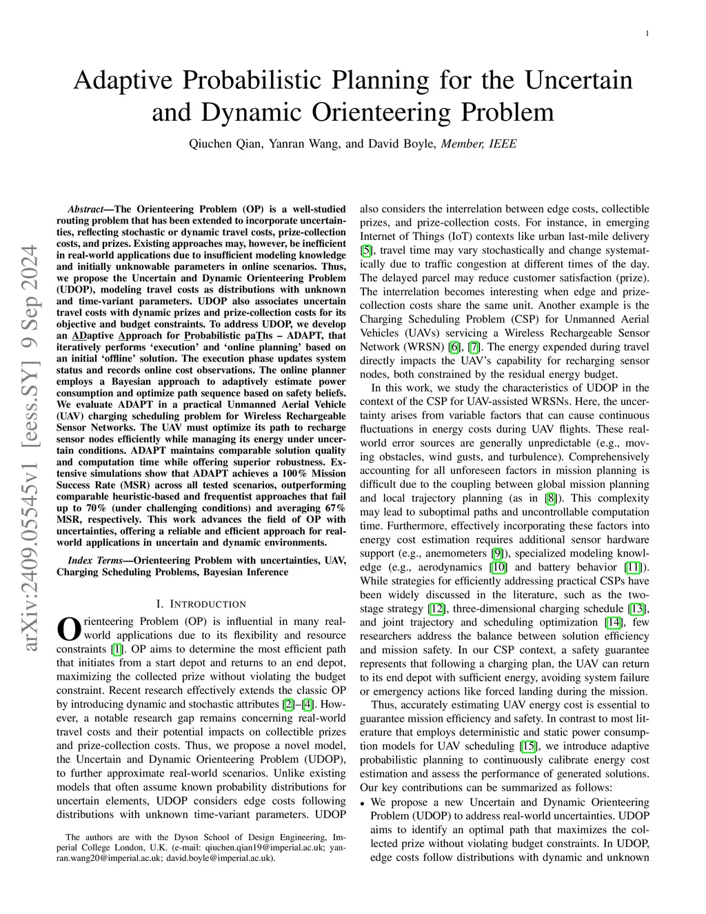 The Orienteering Problem (OP) is a well-studied routing problem that has been extended to incorporate uncertainties, reflecting stochastic or dynamic travel costs, prize-collection costs, and prizes. Existing approaches may, however, be inefficient in real-world applications due to insufficient modeling knowledge and initially unknowable parameters in online scenarios. Thus, we propose the Uncertain and Dynamic Orienteering Problem (UDOP), modeling travel costs as distributions with unknown and time-variant parameters. UDOP also associates uncertain travel costs with dynamic prizes and prize-collection costs for its objective and budget constraints. To address UDOP, we develop an ADaptive Approach for Probabilistic paThs - ADAPT, that iteratively performs éxecution' and ónline planning' based on an initial óffline' solution. The execution phase updates system status and records online cost observations. The online planner employs a Bayesian approach to adaptively estimate power consumption and optimize path sequence based on safety beliefs. We evaluate ADAPT in a practical Unmanned Aerial Vehicle (UAV) charging scheduling problem for Wireless Rechargeable Sensor Networks. The UAV must optimize its path to recharge sensor nodes efficiently while managing its energy under uncertain conditions. ADAPT maintains comparable solution quality and computation time while offering superior robustness. Extensive simulations show that ADAPT achieves a 100% Mission Success Rate (MSR) across all tested scenarios, outperforming comparable heuristic-based and frequentist approaches that fail up to 70% (under challenging conditions) and averaging 67% MSR, respectively. This work advances the field of OP with uncertainties, offering a reliable and efficient approach for real-world applications in uncertain and dynamic environments.