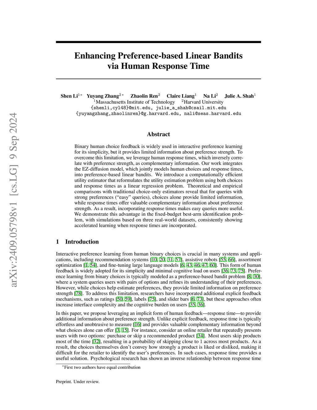 Interactive preference learning systems infer human preferences by presenting queries as pairs of options and collecting binary choices. Although binary choices are simple and widely used, they provide limited information about preference strength. To address this, we leverage human response times, which are inversely related to preference strength, as an additional signal. We propose a computationally efficient method that combines choices and response times to estimate human utility functions, grounded in the EZ diffusion model from psychology. Theoretical and empirical analyses show that for queries with strong preferences, response times complement choices by providing extra information about preference strength, leading to significantly improved utility estimation. We incorporate this estimator into preference-based linear bandits for fixed-budget best-arm identification. Simulations on three real-world datasets demonstrate that using response times significantly accelerates preference learning compared to choice-only approaches. Additional materials, such as code, slides, and talk video, are available atthis https URL