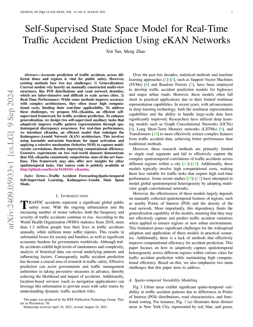 Accurate prediction of traffic accidents across different times and regions is vital for public safety. However, existing methods face two key challenges: 1) Generalization: Current models rely heavily on manually constructed multi-view structures, like POI distributions and road network densities, which are labor-intensive and difficult to scale across cities. 2) Real-Time Performance: While some methods improve accuracy with complex architectures, they often incur high computational costs, limiting their real-time applicability. To address these challenges, we propose SSL-eKamba, an efficient self-supervised framework for traffic accident prediction. To enhance generalization, we design two self-supervised auxiliary tasks that adaptively improve traffic pattern representation through spatiotemporal discrepancy awareness. For real-time performance, we introduce eKamba, an efficient model that redesigns the Kolmogorov-Arnold Network (KAN) architecture. This involves using learnable univariate functions for input activation and applying a selective mechanism (Selective SSM) to capture multi-variate correlations, thereby improving computational efficiency. Extensive experiments on two real-world datasets demonstrate that SSL-eKamba consistently outperforms state-of-the-art baselines. This framework may also offer new insights for other spatiotemporal tasks. Our source code is publicly available at http://github.com/KevinT618/SSL-eKamba.