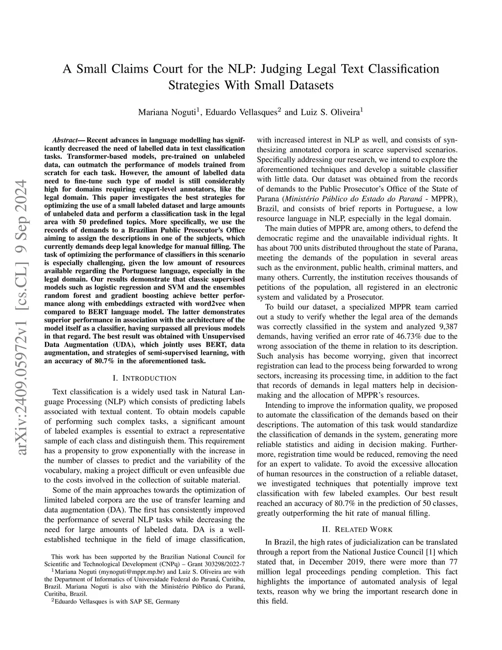 Recent advances in language modelling has significantly decreased the need of labelled data in text classification tasks. Transformer-based models, pre-trained on unlabeled data, can outmatch the performance of models trained from scratch for each task. However, the amount of labelled data need to fine-tune such type of model is still considerably high for domains requiring expert-level annotators, like the legal domain. This paper investigates the best strategies for optimizing the use of a small labeled dataset and large amounts of unlabeled data and perform a classification task in the legal area with 50 predefined topics. More specifically, we use the records of demands to a Brazilian Public Prosecutor's Office aiming to assign the descriptions in one of the subjects, which currently demands deep legal knowledge for manual filling. The task of optimizing the performance of classifiers in this scenario is especially challenging, given the low amount of resources available regarding the Portuguese language, especially in the legal domain. Our results demonstrate that classic supervised models such as logistic regression and SVM and the ensembles random forest and gradient boosting achieve better performance along with embeddings extracted with word2vec when compared to BERT language model. The latter demonstrates superior performance in association with the architecture of the model itself as a classifier, having surpassed all previous models in that regard. The best result was obtained with Unsupervised Data Augmentation (UDA), which jointly uses BERT, data augmentation, and strategies of semi-supervised learning, with an accuracy of 80.7% in the aforementioned task.