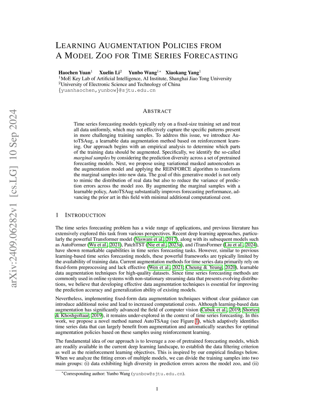 Time series forecasting, particularly in few-shot learning scenarios, is challenging due to the limited availability of high-quality training data. To address this, we present a pilot study on using reinforcement learning (RL) for time series data augmentation. Our method, ReAugment, tackles three critical questions: which parts of the training set should be augmented, how the augmentation should be performed, and what advantages RL brings to the process. Specifically, our approach maintains a forecasting model zoo, and by measuring prediction diversity across the models, we identify samples with higher probabilities for overfitting and use them as the anchor points for augmentation. Leveraging RL, our method adaptively transforms the overfit-prone samples into new data that not only enhances training set diversity but also directs the augmented data to target regions where the forecasting models are prone to overfitting. We validate the effectiveness of ReAugment across a wide range of base models, showing its advantages in both standard time series forecasting and few-shot learning tasks.