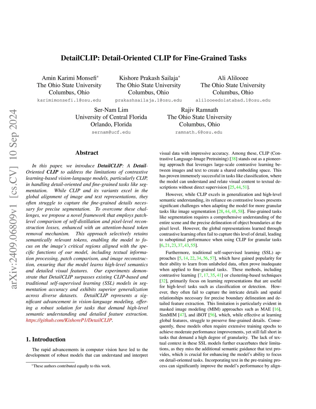 In this paper, we introduce DetailCLIP: A Detail-Oriented CLIP to address the limitations of contrastive learning-based vision-language models, particularly CLIP, in handling detail-oriented and fine-grained tasks like segmentation. While CLIP and its variants excel in the global alignment of image and text representations, they often struggle to capture the fine-grained details necessary for precise segmentation. To overcome these challenges, we propose a novel framework that employs patch-level comparison of self-distillation and pixel-level reconstruction losses, enhanced with an attention-based token removal mechanism. This approach selectively retains semantically relevant tokens, enabling the model to focus on the image's critical regions aligned with the specific functions of our model, including textual information processing, patch comparison, and image reconstruction, ensuring that the model learns high-level semantics and detailed visual features. Our experiments demonstrate that DetailCLIP surpasses existing CLIP-based and traditional self-supervised learning (SSL) models in segmentation accuracy and exhibits superior generalization across diverse datasets. DetailCLIP represents a significant advancement in vision-language modeling, offering a robust solution for tasks that demand high-level semantic understanding and detailed feature extraction.this https URL.