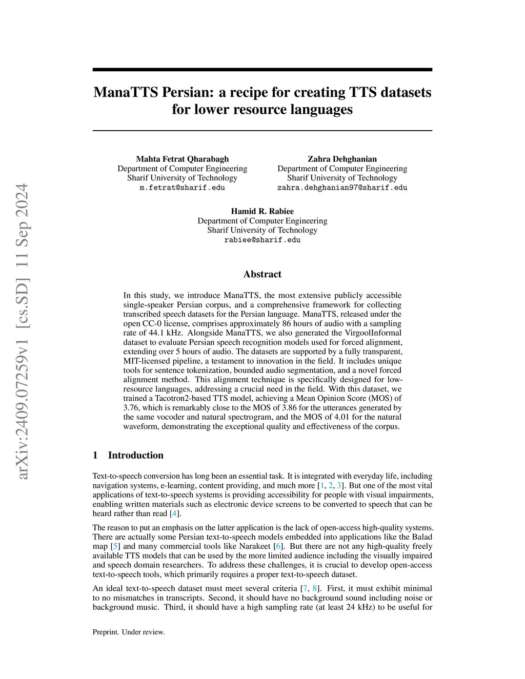 In this study, we introduce ManaTTS, the most extensive publicly accessible single-speaker Persian corpus, and a comprehensive framework for collecting transcribed speech datasets for the Persian language. ManaTTS, released under the open CC-0 license, comprises approximately 86 hours of audio with a sampling rate of 44.1 kHz. Alongside ManaTTS, we also generated the VirgoolInformal dataset to evaluate Persian speech recognition models used for forced alignment, extending over 5 hours of audio. The datasets are supported by a fully transparent, MIT-licensed pipeline, a testament to innovation in the field. It includes unique tools for sentence tokenization, bounded audio segmentation, and a novel forced alignment method. This alignment technique is specifically designed for low-resource languages, addressing a crucial need in the field. With this dataset, we trained a Tacotron2-based TTS model, achieving a Mean Opinion Score (MOS) of 3.76, which is remarkably close to the MOS of 3.86 for the utterances generated by the same vocoder and natural spectrogram, and the MOS of 4.01 for the natural waveform, demonstrating the exceptional quality and effectiveness of the corpus.