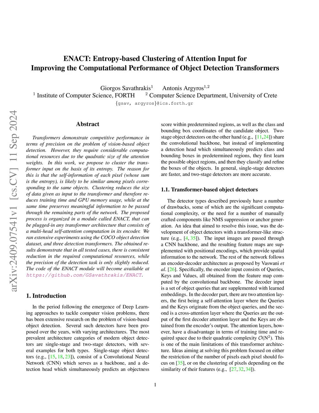 ENACT: Entropy-based Clustering of Attention Input for Reducing the Computational Needs of Object Detection Transformers