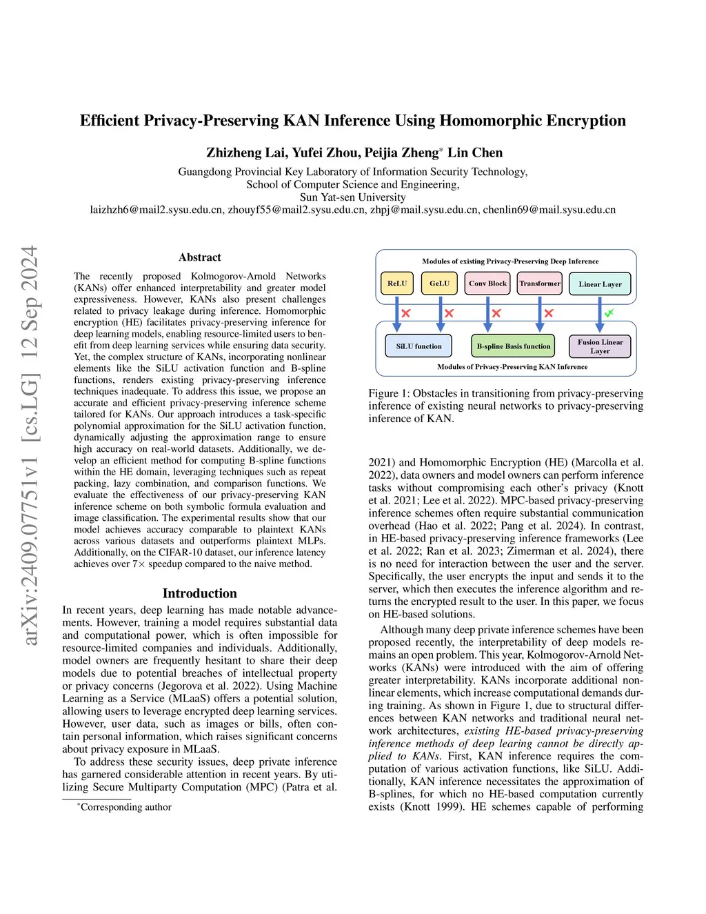 The recently proposed Kolmogorov-Arnold Networks (KANs) offer enhanced interpretability and greater model expressiveness. However, KANs also present challenges related to privacy leakage during inference. Homomorphic encryption (HE) facilitates privacy-preserving inference for deep learning models, enabling resource-limited users to benefit from deep learning services while ensuring data security. Yet, the complex structure of KANs, incorporating nonlinear elements like the SiLU activation function and B-spline functions, renders existing privacy-preserving inference techniques inadequate. To address this issue, we propose an accurate and efficient privacy-preserving inference scheme tailored for KANs. Our approach introduces a task-specific polynomial approximation for the SiLU activation function, dynamically adjusting the approximation range to ensure high accuracy on real-world datasets. Additionally, we develop an efficient method for computing B-spline functions within the HE domain, leveraging techniques such as repeat packing, lazy combination, and comparison functions. We evaluate the effectiveness of our privacy-preserving KAN inference scheme on both symbolic formula evaluation and image classification. The experimental results show that our model achieves accuracy comparable to plaintext KANs across various datasets and outperforms plaintext MLPs. Additionally, on the CIFAR-10 dataset, our inference latency achieves over 7 times speedup compared to the naive method.