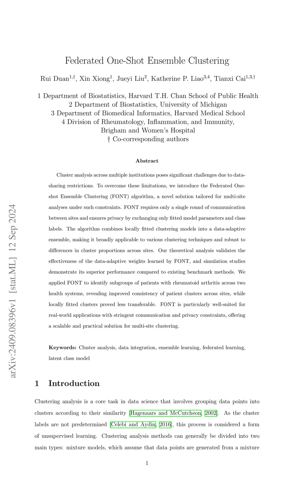 Cluster analysis across multiple institutions poses significant challenges due to data-sharing restrictions. To overcome these limitations, we introduce the Federated One-shot Ensemble Clustering (FONT) algorithm, a novel solution tailored for multi-site analyses under such constraints. FONT requires only a single round of communication between sites and ensures privacy by exchanging only fitted model parameters and class labels. The algorithm combines locally fitted clustering models into a data-adaptive ensemble, making it broadly applicable to various clustering techniques and robust to differences in cluster proportions across sites. Our theoretical analysis validates the effectiveness of the data-adaptive weights learned by FONT, and simulation studies demonstrate its superior performance compared to existing benchmark methods. We applied FONT to identify subgroups of patients with rheumatoid arthritis across two health systems, revealing improved consistency of patient clusters across sites, while locally fitted clusters proved less transferable. FONT is particularly well-suited for real-world applications with stringent communication and privacy constraints, offering a scalable and practical solution for multi-site clustering.