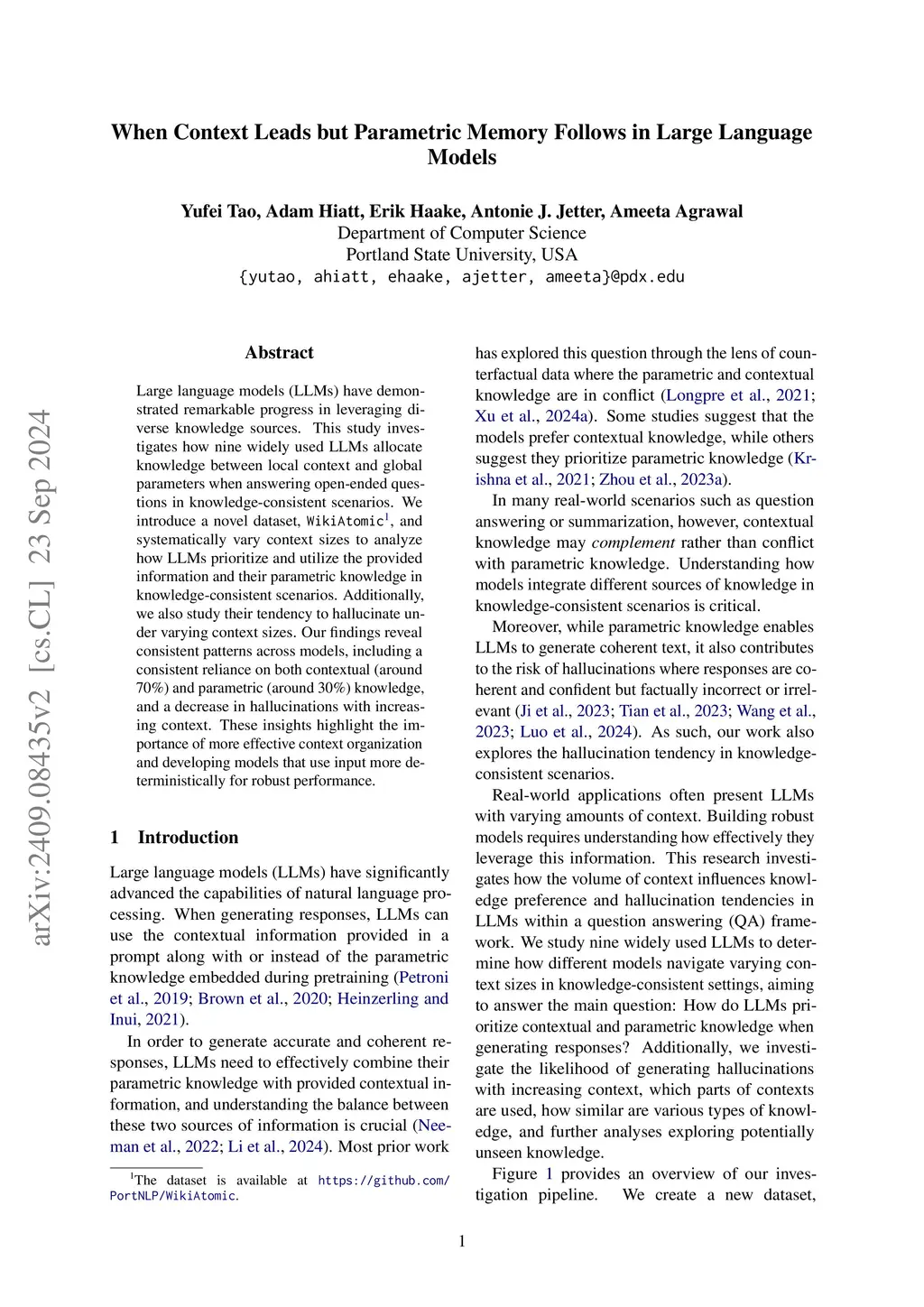Large language models (LLMs) have demonstrated remarkable progress in leveraging diverse knowledge sources. This study investigates how nine widely used LLMs allocate knowledge between local context and global parameters when answering open-ended questions in knowledge-consistent scenarios. We introduce a novel dataset, WikiAtomic, and systematically vary context sizes to analyze how LLMs prioritize and utilize the provided information and their parametric knowledge in knowledge-consistent scenarios. Additionally, we also study their tendency to hallucinate under varying context sizes. Our findings reveal consistent patterns across models, including a consistent reliance on both contextual (around 70%) and parametric (around 30%) knowledge, and a decrease in hallucinations with increasing context. These insights highlight the importance of more effective context organization and developing models that use input more deterministically for robust performance.