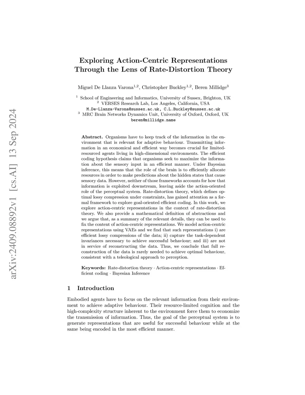 Organisms have to keep track of the information in the environment that is relevant for adaptive behaviour. Transmitting information in an economical and efficient way becomes crucial for limited-resourced agents living in high-dimensional environments. The efficient coding hypothesis claims that organisms seek to maximize the information about the sensory input in an efficient manner. Under Bayesian inference, this means that the role of the brain is to efficiently allocate resources in order to make predictions about the hidden states that cause sensory data. However, neither of those frameworks accounts for how that information is exploited downstream, leaving aside the action-oriented role of the perceptual system. Rate-distortion theory, which defines optimal lossy compression under constraints, has gained attention as a formal framework to explore goal-oriented efficient coding. In this work, we explore action-centric representations in the context of rate-distortion theory. We also provide a mathematical definition of abstractions and we argue that, as a summary of the relevant details, they can be used to fix the content of action-centric representations. We model action-centric representations using VAEs and we find that such representations i) are efficient lossy compressions of the data; ii) capture the task-dependent invariances necessary to achieve successful behaviour; and iii) are not in service of reconstructing the data. Thus, we conclude that full reconstruction of the data is rarely needed to achieve optimal behaviour, consistent with a teleological approach to perception.