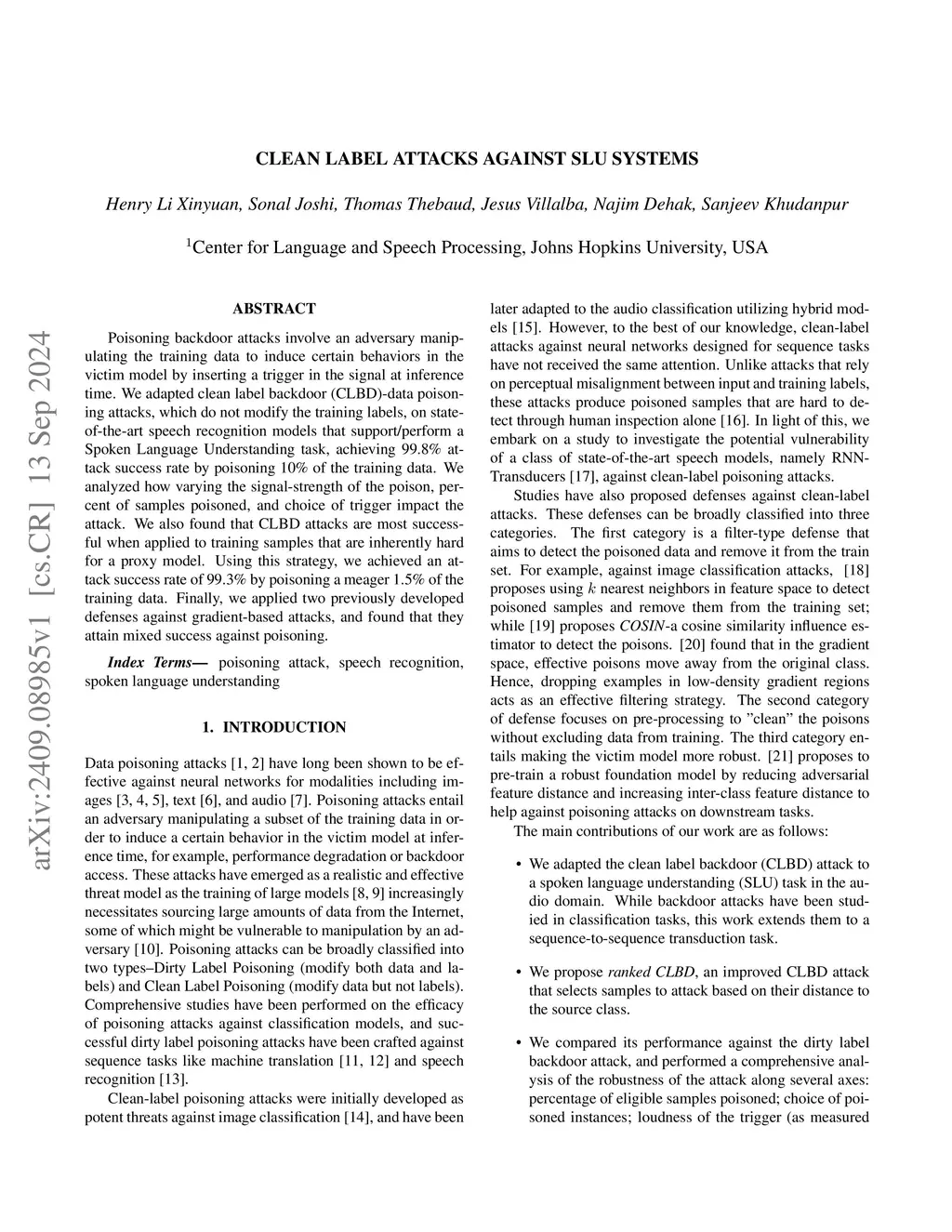 Poisoning backdoor attacks involve an adversary manipulating the training data to induce certain behaviors in the victim model by inserting a trigger in the signal at inference time. We adapted clean label backdoor (CLBD)-data poisoning attacks, which do not modify the training labels, on state-of-the-art speech recognition models that support/perform a Spoken Language Understanding task, achieving 99.8% attack success rate by poisoning 10% of the training data. We analyzed how varying the signal-strength of the poison, percent of samples poisoned, and choice of trigger impact the attack. We also found that CLBD attacks are most successful when applied to training samples that are inherently hard for a proxy model. Using this strategy, we achieved an attack success rate of 99.3% by poisoning a meager 1.5% of the training data. Finally, we applied two previously developed defenses against gradient-based attacks, and found that they attain mixed success against poisoning.