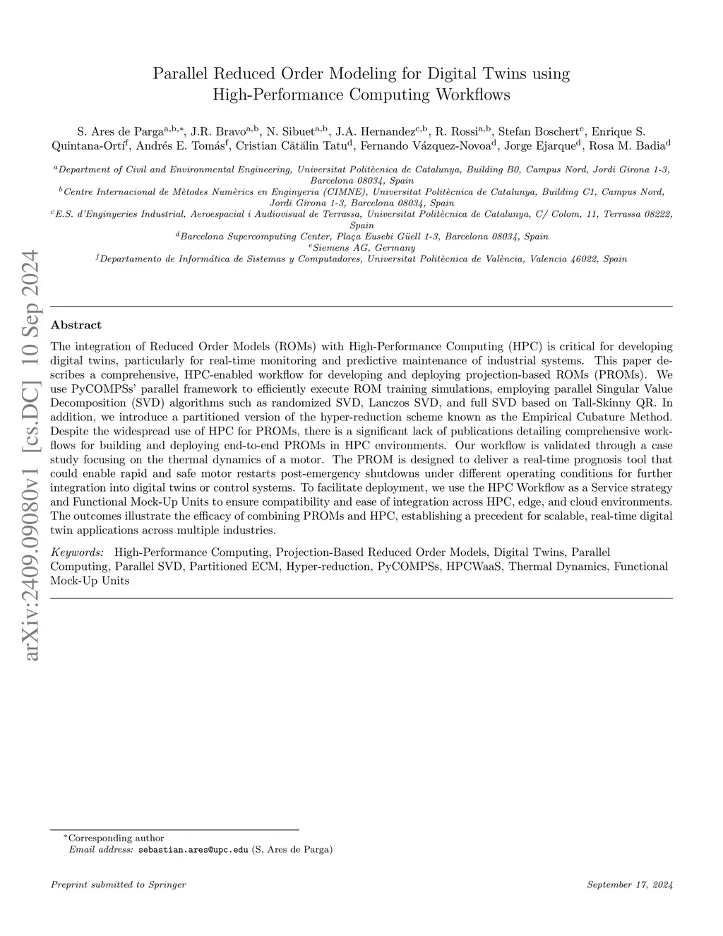 The integration of Reduced Order Models (ROMs) with High-Performance Computing (HPC) is critical for developing digital twins, particularly for real-time monitoring and predictive maintenance of industrial systems. This paper describes a comprehensive, HPC-enabled workflow for developing and deploying projection-based ROMs (PROMs). We use PyCOMPSs' parallel framework to efficiently execute ROM training simulations, employing parallel Singular Value Decomposition (SVD) algorithms such as randomized SVD, Lanczos SVD, and full SVD based on Tall-Skinny QR. In addition, we introduce a partitioned version of the hyper-reduction scheme known as the Empirical Cubature Method. Despite the widespread use of HPC for PROMs, there is a significant lack of publications detailing comprehensive workflows for building and deploying end-to-end PROMs in HPC environments. Our workflow is validated through a case study focusing on the thermal dynamics of a motor. The PROM is designed to deliver a real-time prognosis tool that could enable rapid and safe motor restarts post-emergency shutdowns under different operating conditions for further integration into digital twins or control systems. To facilitate deployment, we use the HPC Workflow as a Service strategy and Functional Mock-Up Units to ensure compatibility and ease of integration across HPC, edge, and cloud environments. The outcomes illustrate the efficacy of combining PROMs and HPC, establishing a precedent for scalable, real-time digital twin applications across multiple industries.