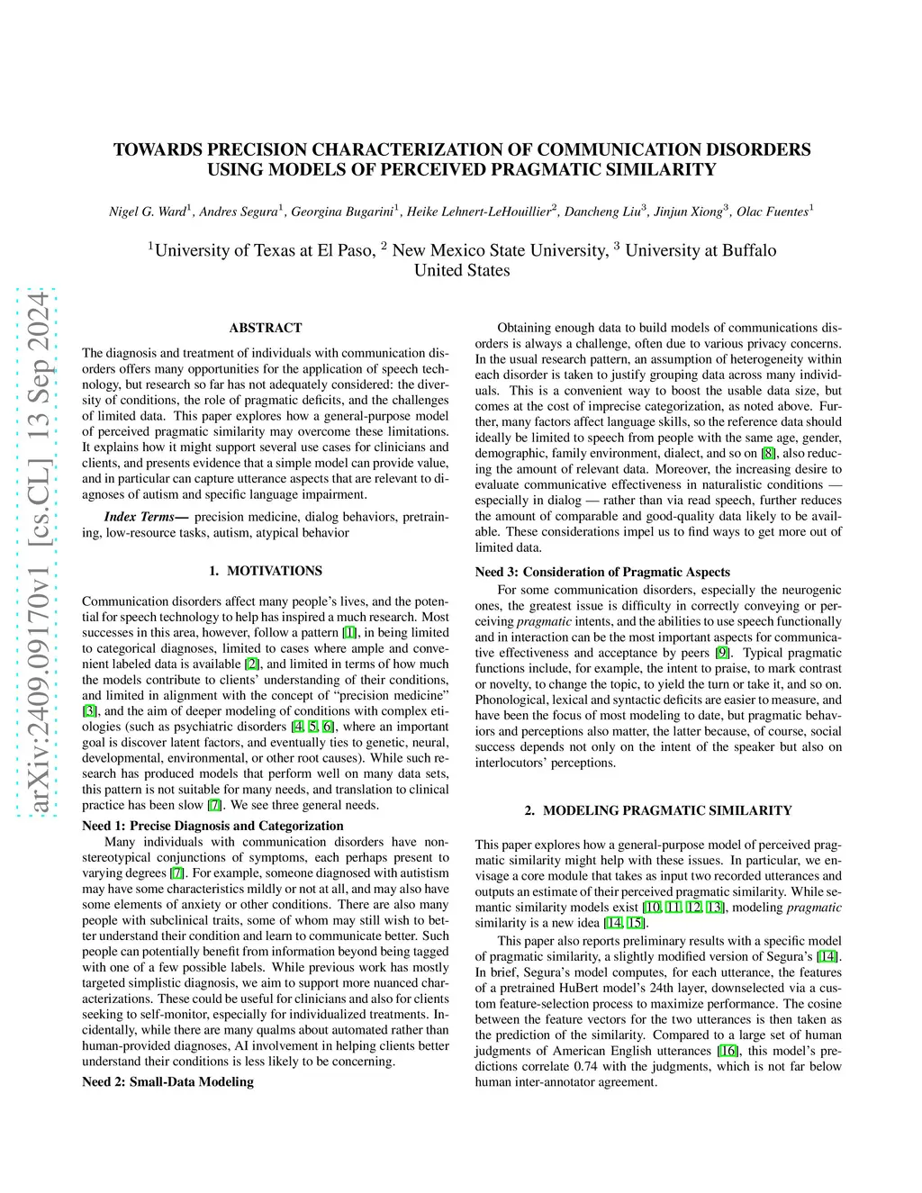 The diagnosis and treatment of individuals with communication disorders offers many opportunities for the application of speech technology, but research so far has not adequately considered: the diversity of conditions, the role of pragmatic deficits, and the challenges of limited data. This paper explores how a general-purpose model of perceived pragmatic similarity may overcome these limitations. It explains how it might support several use cases for clinicians and clients, and presents evidence that a simple model can provide value, and in particular can capture utterance aspects that are relevant to diagnoses of autism and specific language impairment.