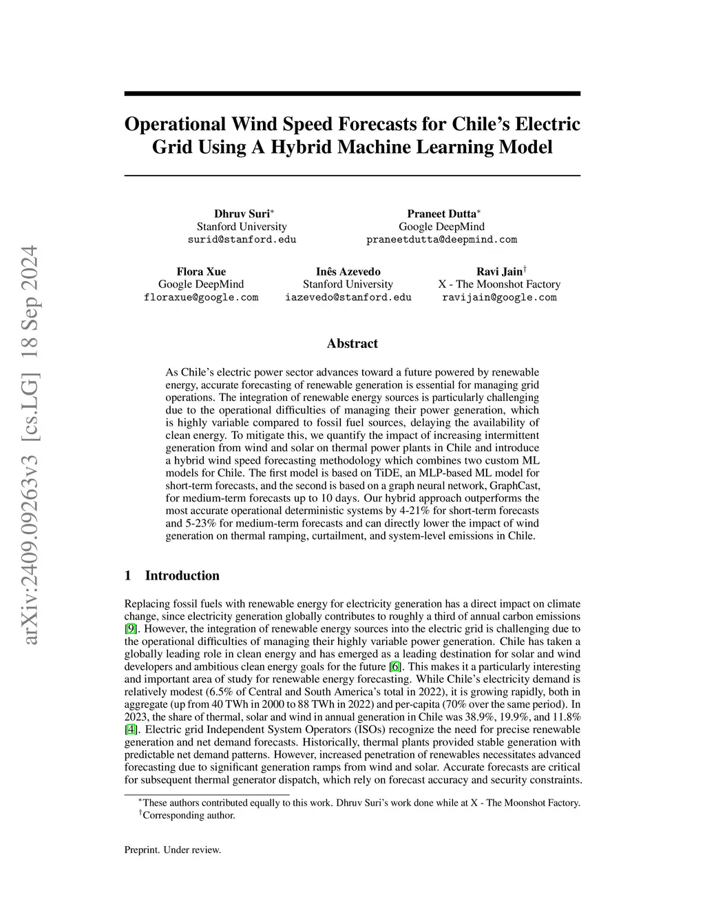 As Chile's electric power sector advances toward a future powered by renewable energy, accurate forecasting of renewable generation is essential for managing grid operations. The integration of renewable energy sources is particularly challenging due to the operational difficulties of managing their power generation, which is highly variable compared to fossil fuel sources, delaying the availability of clean energy. To mitigate this, we quantify the impact of increasing intermittent generation from wind and solar on thermal power plants in Chile and introduce a hybrid wind speed forecasting methodology which combines two custom ML models for Chile. The first model is based on TiDE, an MLP-based ML model for short-term forecasts, and the second is based on a graph neural network, GraphCast, for medium-term forecasts up to 10 days. Our hybrid approach outperforms the most accurate operational deterministic systems by 4-21% for short-term forecasts and 5-23% for medium-term forecasts and can directly lower the impact of wind generation on thermal ramping, curtailment, and system-level emissions in Chile.