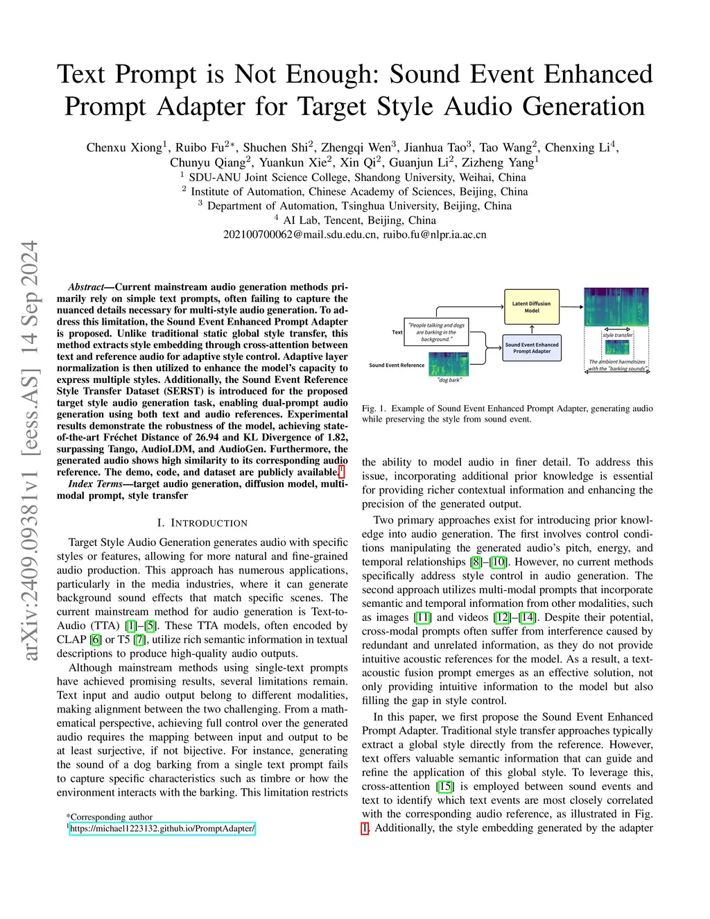Current mainstream audio generation methods primarily rely on simple text prompts, often failing to capture the nuanced details necessary for multi-style audio generation. To address this limitation, the Sound Event Enhanced Prompt Adapter is proposed. Unlike traditional static global style transfer, this method extracts style embedding through cross-attention between text and reference audio for adaptive style control. Adaptive layer normalization is then utilized to enhance the model's capacity to express multiple styles. Additionally, the Sound Event Reference Style Transfer Dataset (SERST) is introduced for the proposed target style audio generation task, enabling dual-prompt audio generation using both text and audio references. Experimental results demonstrate the robustness of the model, achieving state-of-the-art Fr\échet Distance of 26.94 and KL Divergence of 1.82, surpassing Tango, AudioLDM, and AudioGen. Furthermore, the generated audio shows high similarity to its corresponding audio reference. The demo, code, and dataset are publicly available.