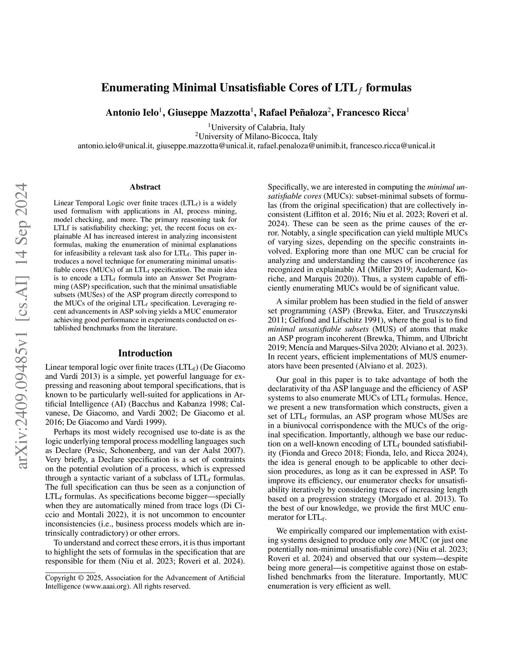 Linear Temporal Logic over finite traces () is a widely used formalism with applications in AI, process mining, model checking, and more. The primary reasoning task for is satisfiability checking; yet, the recent focus on explainable AI has increased interest in analyzing inconsistent formulas, making the enumeration of minimal explanations for infeasibility a relevant task also for . This paper introduces a novel technique for enumerating minimal unsatisfiable cores (MUCs) of an specification. The main idea is to encode a formula into an Answer Set Programming (ASP) specification, such that the minimal unsatisfiable subsets (MUSes) of the ASP program directly correspond to the MUCs of the original specification. Leveraging recent advancements in ASP solving yields a MUC enumerator achieving good performance in experiments conducted on established benchmarks from the literature.
