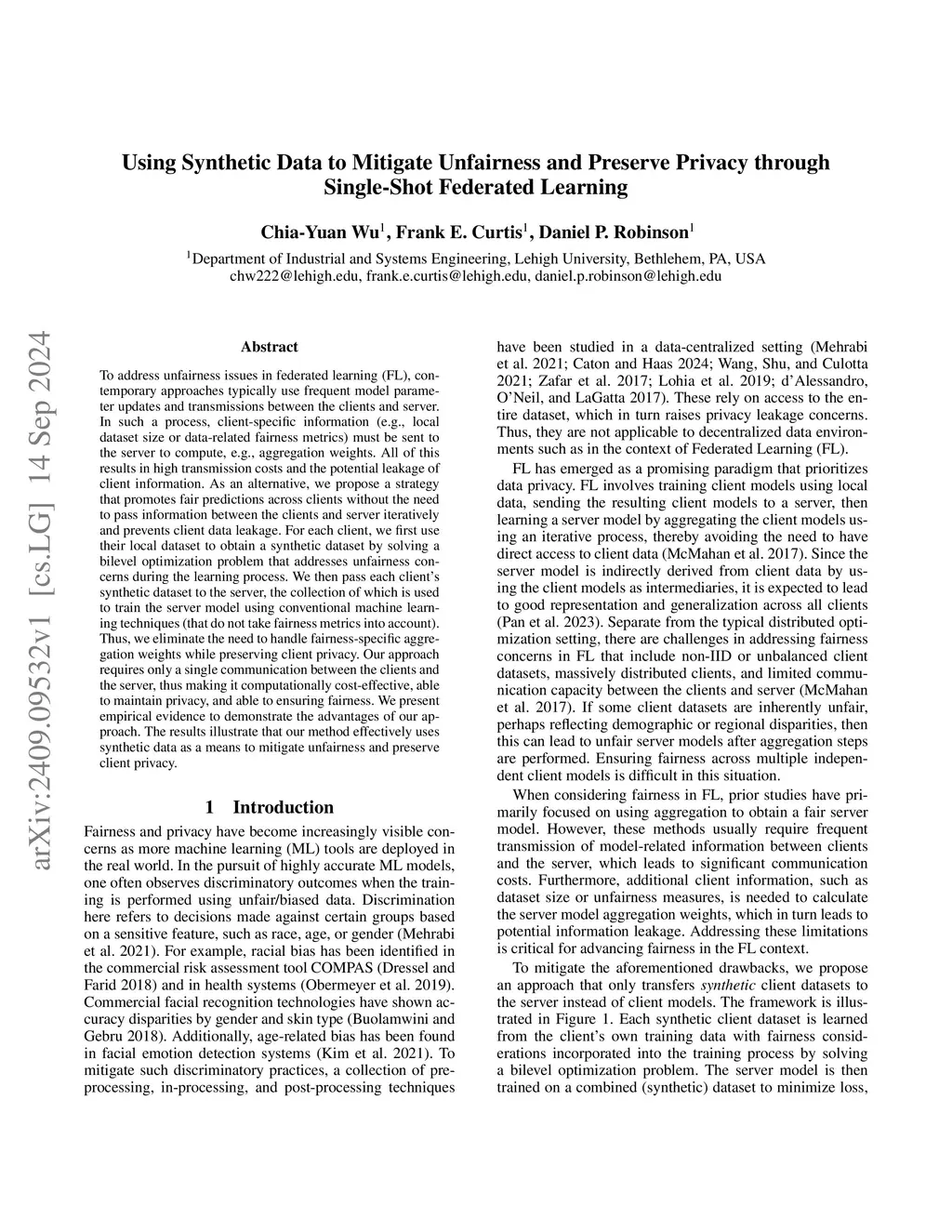 In distributed computing environments, collaborative machine learning enables multiple clients to train a global model collaboratively. To preserve privacy in such settings, a common technique is to utilize frequent updates and transmissions of model parameters. However, this results in high communication costs between the clients and the server. To tackle unfairness concerns in distributed environments, client-specific information (e.g., local dataset size or data-related fairness metrics) must be sent to the server to compute algorithmic quantities (e.g., aggregation weights), which leads to a potential leakage of client information. To address these challenges, we propose a two-stage strategy that promotes fair predictions, prevents client-data leakage, and reduces communication costs in certain scenarios without the need to pass information between clients and server iteratively. In the first stage, for each client, we use its local dataset to obtain a synthetic dataset by solving a bilevel optimization problem that aims to ensure that the ultimate global model yields fair predictions. In the second stage, we apply a method with differential privacy guarantees to the synthetic dataset from the first stage to obtain a second synthetic data. We then pass each client's second-stage synthetic dataset to the server, the collection of which is used to train the server model using conventional machine learning techniques (that no longer need to take fairness metrics or privacy into account). Thus, we eliminate the need to handle fairness-specific aggregation weights while preserving client privacy. Our approach requires only a single communication between the clients and the server (thus making it communication cost-effective), maintains data privacy, and promotes fairness. We present empirical evidence to demonstrate the advantages of our approach.