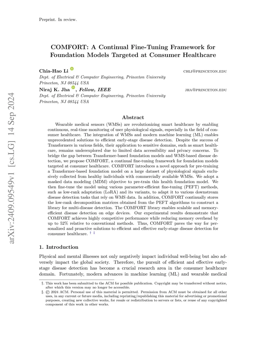Wearable medical sensors (WMSs) are revolutionizing smart healthcare by enabling continuous, real-time monitoring of user physiological signals, especially in the field of consumer healthcare. The integration of WMSs and modern machine learning (ML) enables unprecedented solutions to efficient early-stage disease detection. Despite the success of Transformers in various fields, their application to sensitive domains, such as smart healthcare, remains underexplored due to limited data accessibility and privacy concerns. To bridge the gap between Transformer-based foundation models and WMS-based disease detection, we propose COMFORT, a continual fine-tuning framework for foundation models targeted at consumer healthcare. COMFORT introduces a novel approach for pre-training a Transformer-based foundation model on a large dataset of physiological signals exclusively collected from healthy individuals with commercially available WMSs. We adopt a masked data modeling (MDM) objective to pre-train this health foundation model. We then fine-tune the model using various parameter-efficient fine-tuning (PEFT) methods, such as low-rank adaptation (LoRA) and its variants, to adapt it to various downstream disease detection tasks that rely on WMS data. In addition, COMFORT continually stores the low-rank decomposition matrices obtained from the PEFT algorithms to construct a library for multi-disease detection. The COMFORT library enables scalable and memory-efficient disease detection on edge devices. Our experimental results demonstrate that COMFORT achieves highly competitive performance while reducing memory overhead by up to 52% relative to conventional methods. Thus, COMFORT paves the way for personalized and proactive solutions to efficient and effective early-stage disease detection for consumer healthcare.