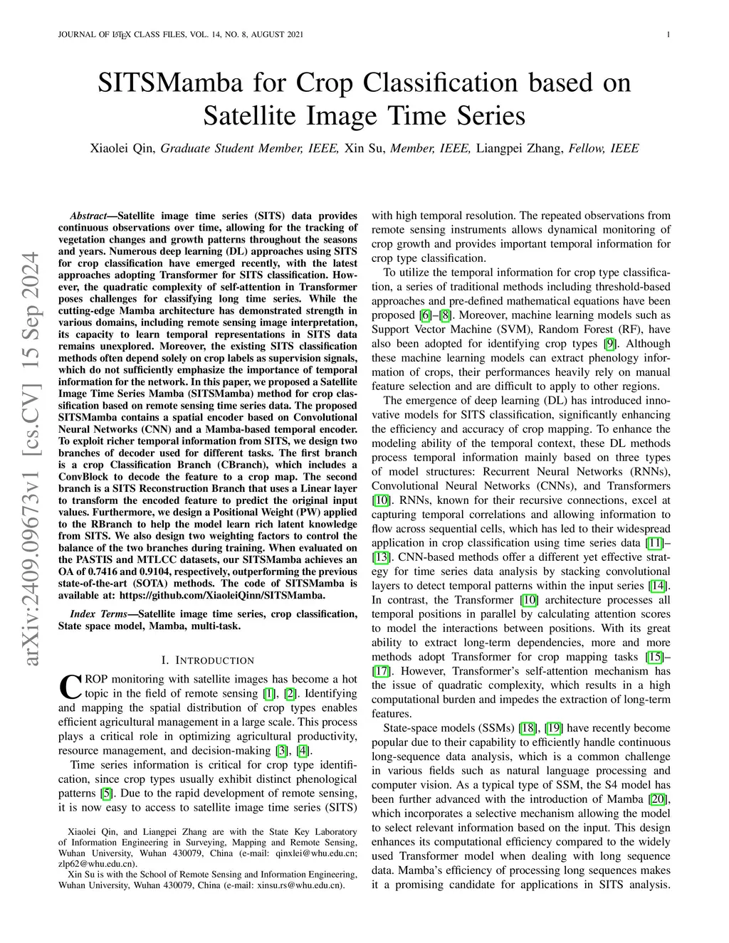 SITSMamba for Crop Classification based on Satellite Image Time Series