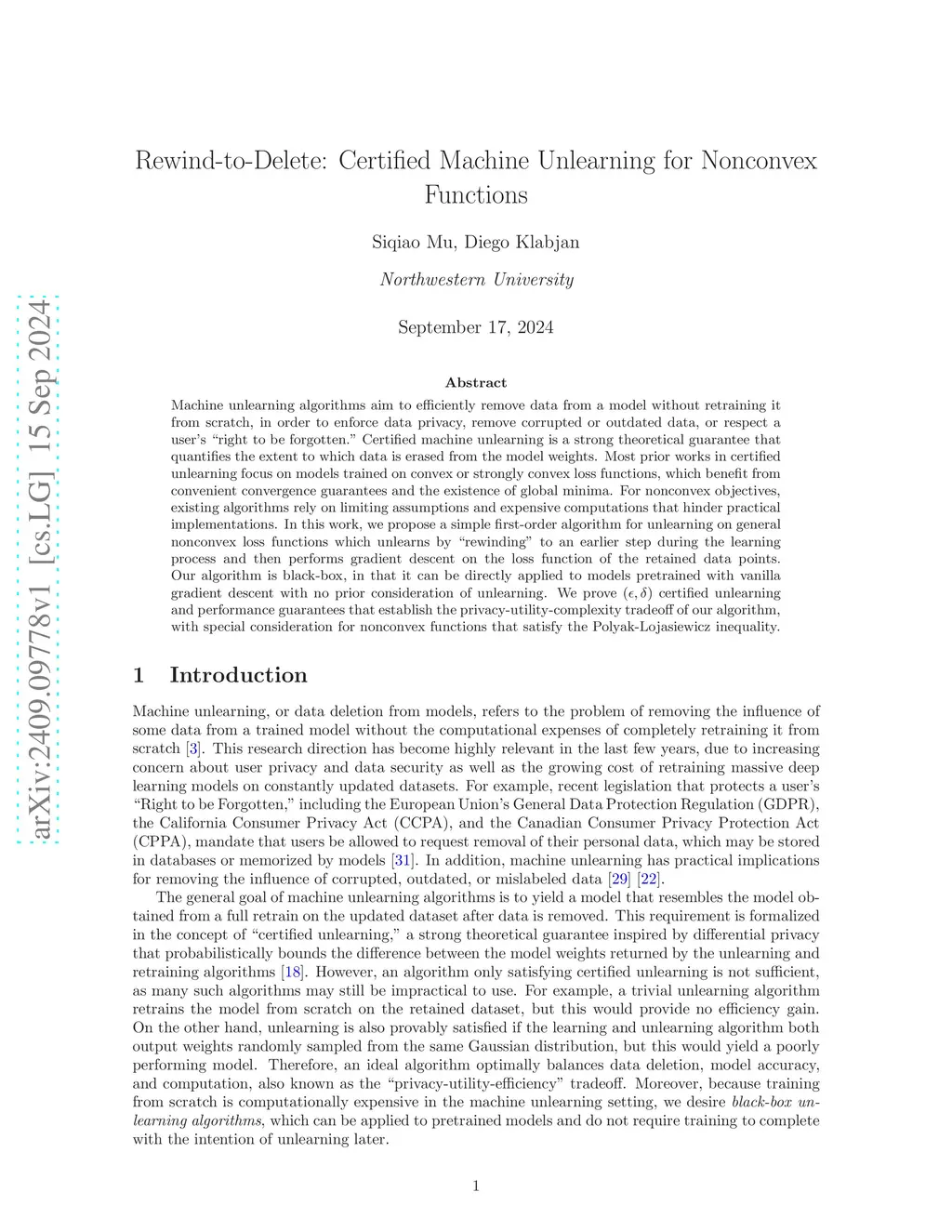 Rewind-to-Delete: Certified Machine Unlearning for Nonconvex Functions