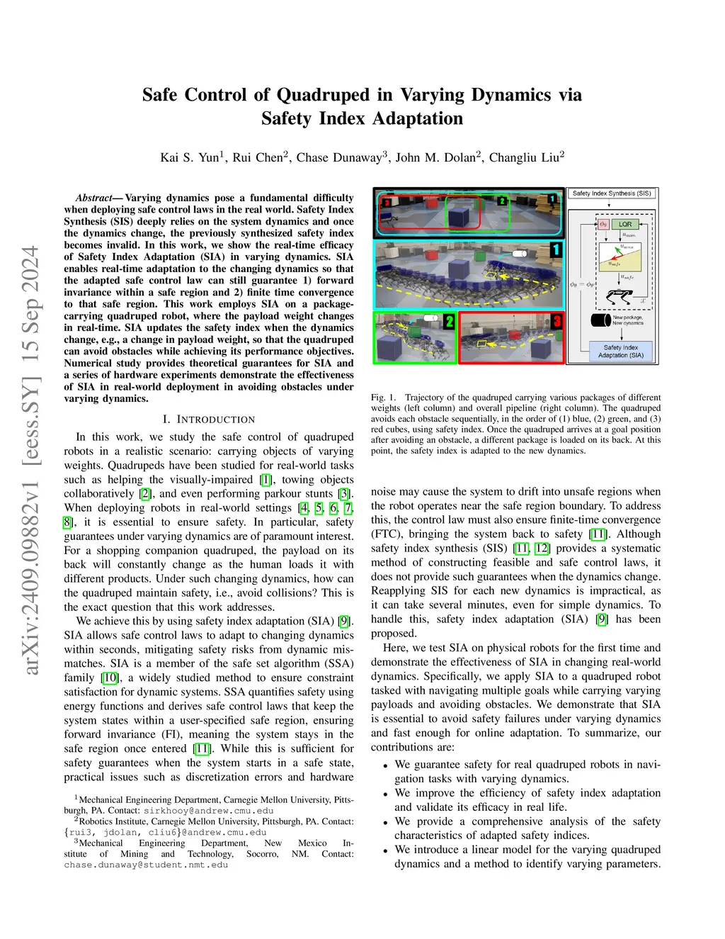 Safe Control of Quadruped in Varying Dynamics via Safety Index