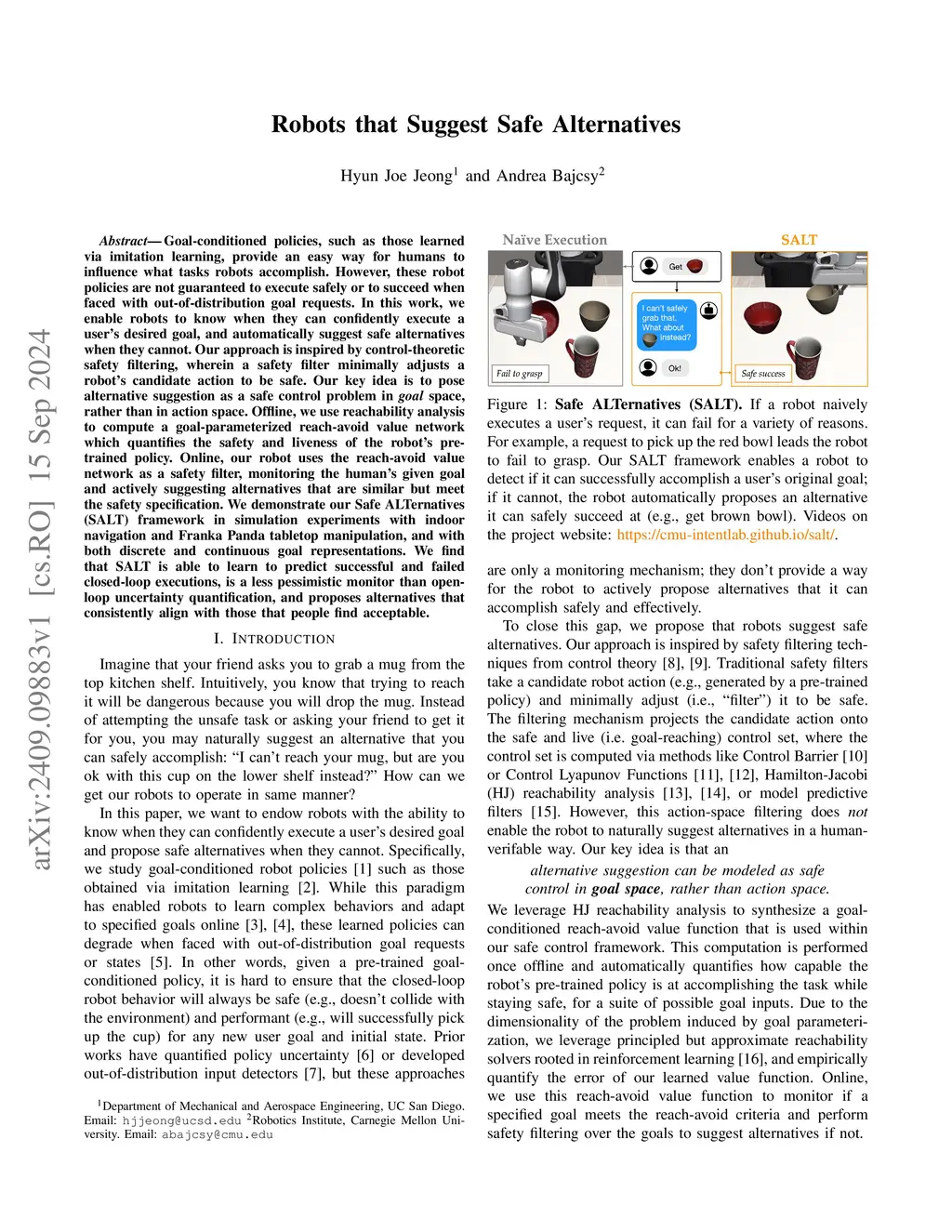 Goal-conditioned policies, such as those learned via imitation learning, provide an easy way for humans to influence what tasks robots accomplish. However, these robot policies are not guaranteed to execute safely or to succeed when faced with out-of-distribution requests. In this work, we enable robots to know when they can confidently execute a user's desired goal, and automatically suggest safe alternatives when they cannot. Our approach is inspired by control-theoretic safety filtering, wherein a safety filter minimally adjusts a robot's candidate action to be safe. Our key idea is to pose alternative suggestion as a safe control problem in goal space, rather than in action space. Offline, we use reachability analysis to compute a goal-parameterized reach-avoid value network which quantifies the safety and liveness of the robot's pre-trained policy. Online, our robot uses the reach-avoid value network as a safety filter, monitoring the human's given goal and actively suggesting alternatives that are similar but meet the safety specification. We demonstrate our Safe ALTernatives (SALT) framework in simulation experiments with indoor navigation and Franka Panda tabletop manipulation, and with both discrete and continuous goal representations. We find that SALT is able to learn to predict successful and failed closed-loop executions, is a less pessimistic monitor than open-loop uncertainty quantification, and proposes alternatives that consistently align with those people find acceptable.