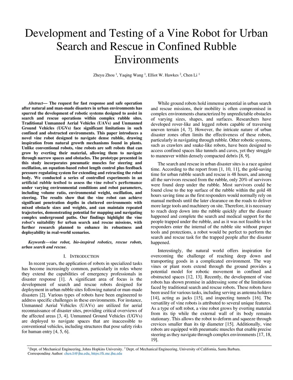 Development and Testing of a Vine Robot for Urban Search and Rescue in Confined Rubble Environments