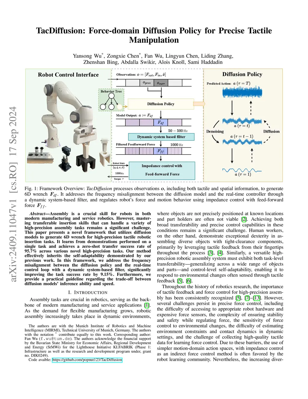 Assembly is a crucial skill for robots in both modern manufacturing and service robotics. However, mastering transferable insertion skills that can handle a variety of high-precision assembly tasks remains a significant challenge. This paper presents a novel framework that utilizes diffusion models to generate 6D wrench for high-precision tactile robotic insertion tasks. It learns from demonstrations performed on a single task and achieves a zero-shot transfer success rate of 95.7% across various novel high-precision tasks. Our method effectively inherits the self-adaptability demonstrated by our previous work. In this framework, we address the frequency misalignment between the diffusion policy and the real-time control loop with a dynamic system-based filter, significantly improving the task success rate by 9.15%. Furthermore, we provide a practical guideline regarding the trade-off between diffusion models' inference ability and speed.