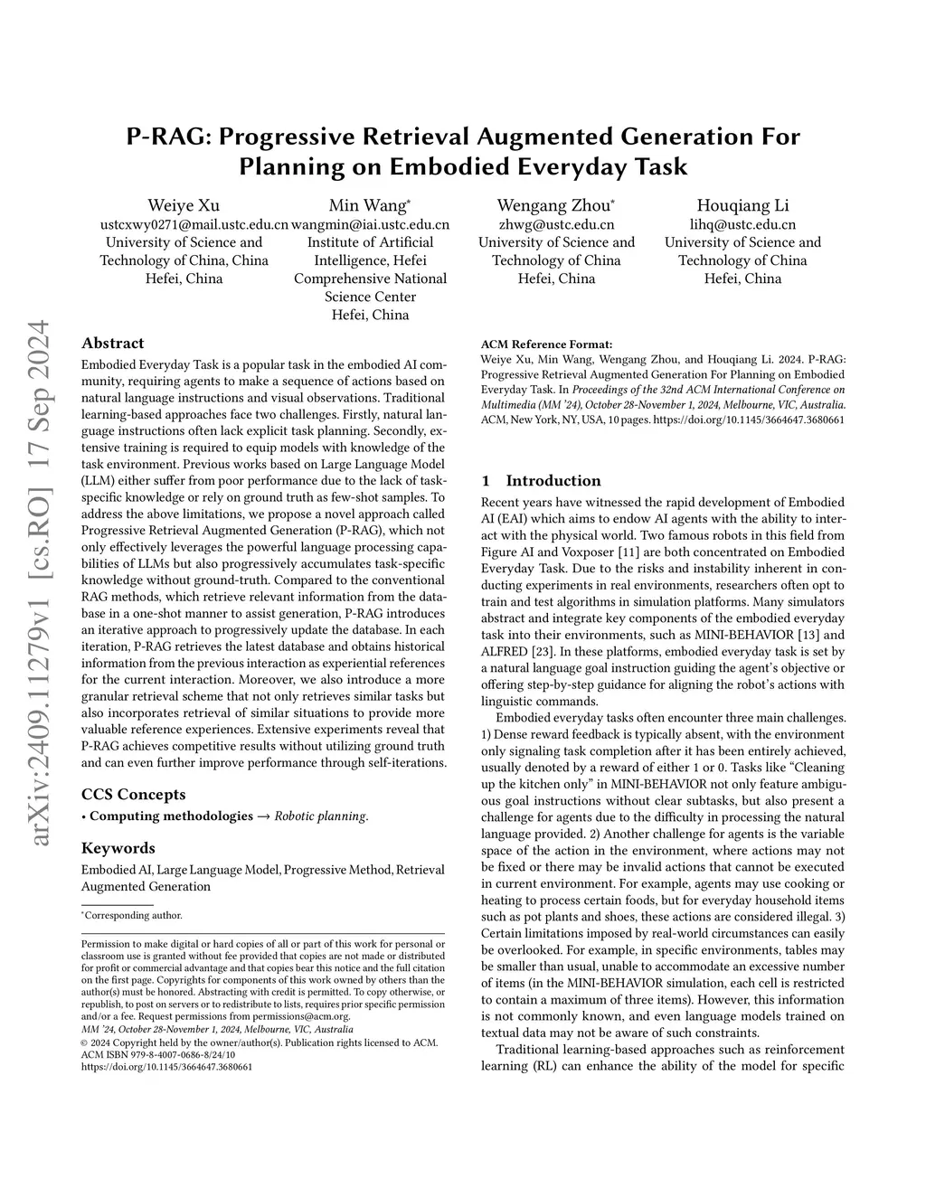 Embodied Everyday Task is a popular task in the embodied AI community, requiring agents to make a sequence of actions based on natural language instructions and visual observations. Traditional learning-based approaches face two challenges. Firstly, natural language instructions often lack explicit task planning. Secondly, extensive training is required to equip models with knowledge of the task environment. Previous works based on Large Language Model (LLM) either suffer from poor performance due to the lack of task-specific knowledge or rely on ground truth as few-shot samples. To address the above limitations, we propose a novel approach called Progressive Retrieval Augmented Generation (P-RAG), which not only effectively leverages the powerful language processing capabilities of LLMs but also progressively accumulates task-specific knowledge without ground-truth. Compared to the conventional RAG methods, which retrieve relevant information from the database in a one-shot manner to assist generation, P-RAG introduces an iterative approach to progressively update the database. In each iteration, P-RAG retrieves the latest database and obtains historical information from the previous interaction as experiential references for the current interaction. Moreover, we also introduce a more granular retrieval scheme that not only retrieves similar tasks but also incorporates retrieval of similar situations to provide more valuable reference experiences. Extensive experiments reveal that P-RAG achieves competitive results without utilizing ground truth and can even further improve performance through self-iterations.