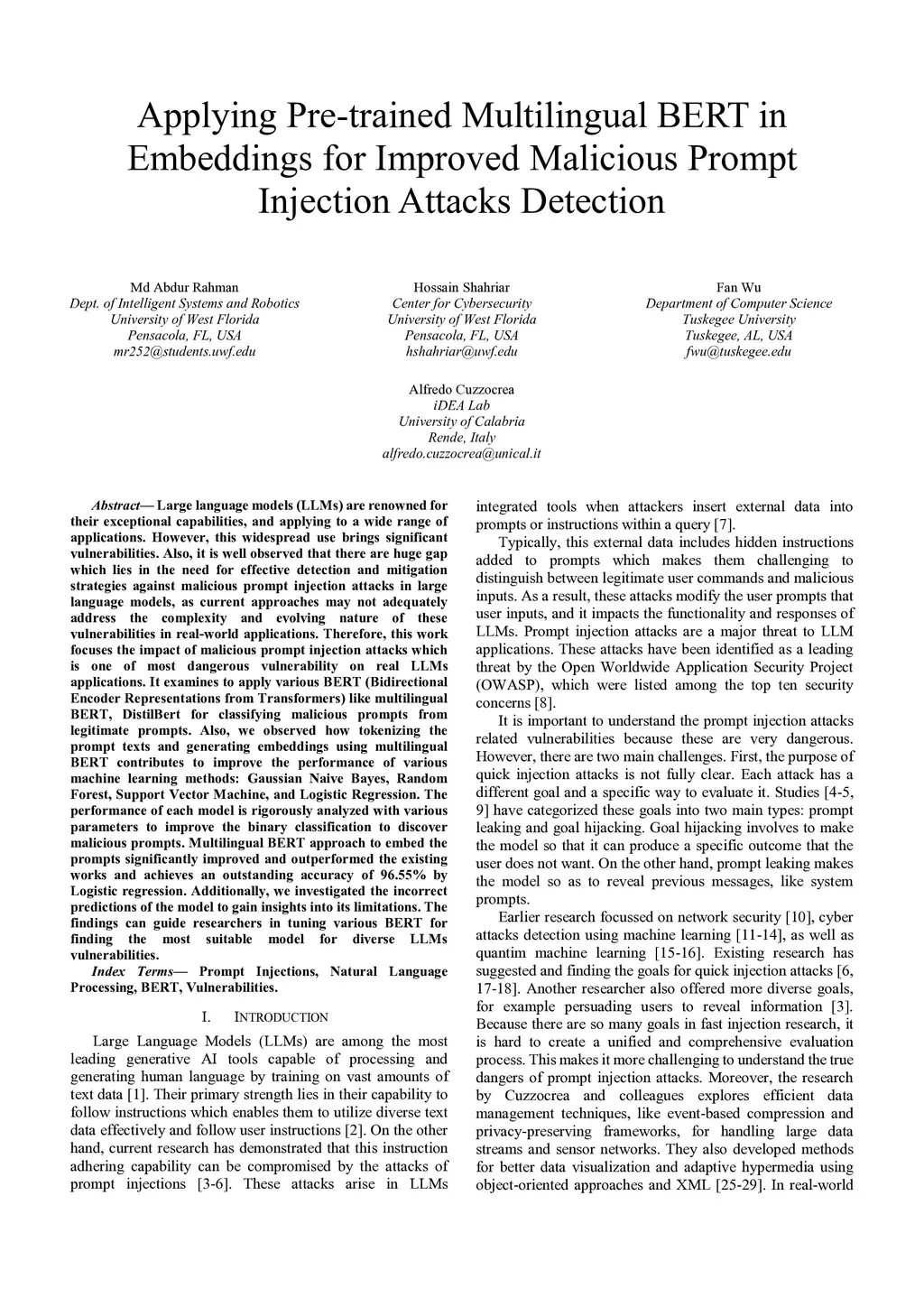 Large language models (LLMs) are renowned for their exceptional capabilities, and applying to a wide range of applications. However, this widespread use brings significant vulnerabilities. Also, it is well observed that there are huge gap which lies in the need for effective detection and mitigation strategies against malicious prompt injection attacks in large language models, as current approaches may not adequately address the complexity and evolving nature of these vulnerabilities in real-world applications. Therefore, this work focuses the impact of malicious prompt injection attacks which is one of most dangerous vulnerability on real LLMs applications. It examines to apply various BERT (Bidirectional Encoder Representations from Transformers) like multilingual BERT, DistilBert for classifying malicious prompts from legitimate prompts. Also, we observed how tokenizing the prompt texts and generating embeddings using multilingual BERT contributes to improve the performance of various machine learning methods: Gaussian Naive Bayes, Random Forest, Support Vector Machine, and Logistic Regression. The performance of each model is rigorously analyzed with various parameters to improve the binary classification to discover malicious prompts. Multilingual BERT approach to embed the prompts significantly improved and outperformed the existing works and achieves an outstanding accuracy of 96.55% by Logistic regression. Additionally, we investigated the incorrect predictions of the model to gain insights into its limitations. The findings can guide researchers in tuning various BERT for finding the most suitable model for diverse LLMs vulnerabilities.