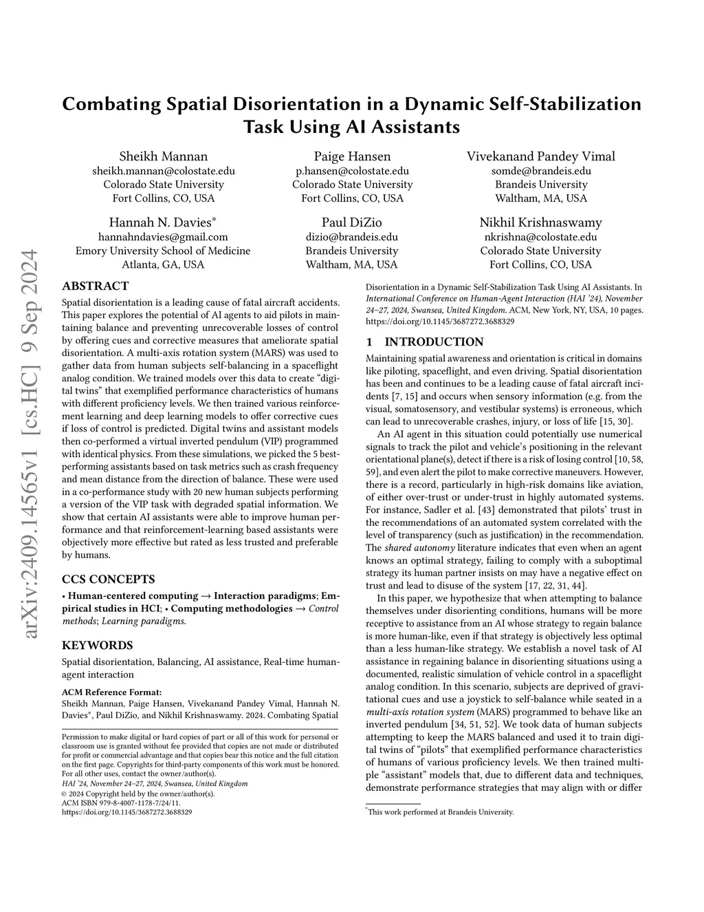 Spatial disorientation is a leading cause of fatal aircraft accidents. This paper explores the potential of AI agents to aid pilots in maintaining balance and preventing unrecoverable losses of control by offering cues and corrective measures that ameliorate spatial disorientation. A multi-axis rotation system (MARS) was used to gather data from human subjects self-balancing in a spaceflight analog condition. We trained models over this data to create "digital twins" that exemplified performance characteristics of humans with different proficiency levels. We then trained various reinforcement learning and deep learning models to offer corrective cues if loss of control is predicted. Digital twins and assistant models then co-performed a virtual inverted pendulum (VIP) programmed with identical physics. From these simulations, we picked the 5 best-performing assistants based on task metrics such as crash frequency and mean distance from the direction of balance. These were used in a co-performance study with 20 new human subjects performing a version of the VIP task with degraded spatial information. We show that certain AI assistants were able to improve human performance and that reinforcement-learning based assistants were objectively more effective but rated as less trusted and preferable by humans.