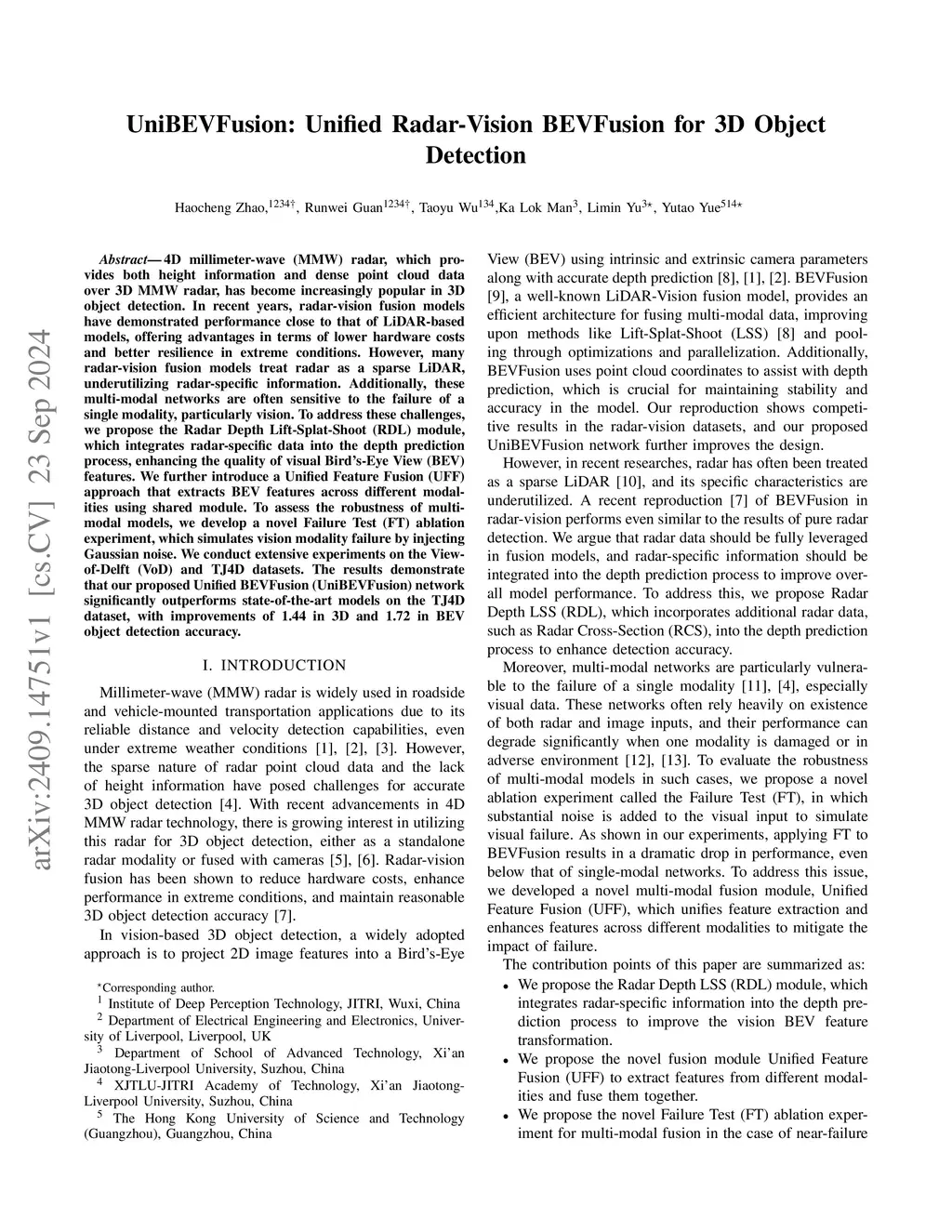 4D millimeter-wave (MMW) radar, which provides both height information and dense point cloud data over 3D MMW radar, has become increasingly popular in 3D object detection. In recent years, radar-vision fusion models have demonstrated performance close to that of LiDAR-based models, offering advantages in terms of lower hardware costs and better resilience in extreme conditions. However, many radar-vision fusion models treat radar as a sparse LiDAR, underutilizing radar-specific information. Additionally, these multi-modal networks are often sensitive to the failure of a single modality, particularly vision. To address these challenges, we propose the Radar Depth Lift-Splat-Shoot (RDL) module, which integrates radar-specific data into the depth prediction process, enhancing the quality of visual Bird-Eye View (BEV) features. We further introduce a Unified Feature Fusion (UFF) approach that extracts BEV features across different modalities using shared module. To assess the robustness of multi-modal models, we develop a novel Failure Test (FT) ablation experiment, which simulates vision modality failure by injecting Gaussian noise. We conduct extensive experiments on the View-of-Delft (VoD) and TJ4D datasets. The results demonstrate that our proposed Unified BEVFusion (UniBEVFusion) network significantly outperforms state-of-the-art models on the TJ4D dataset, with improvements of 1.44 in 3D and 1.72 in BEV object detection accuracy.