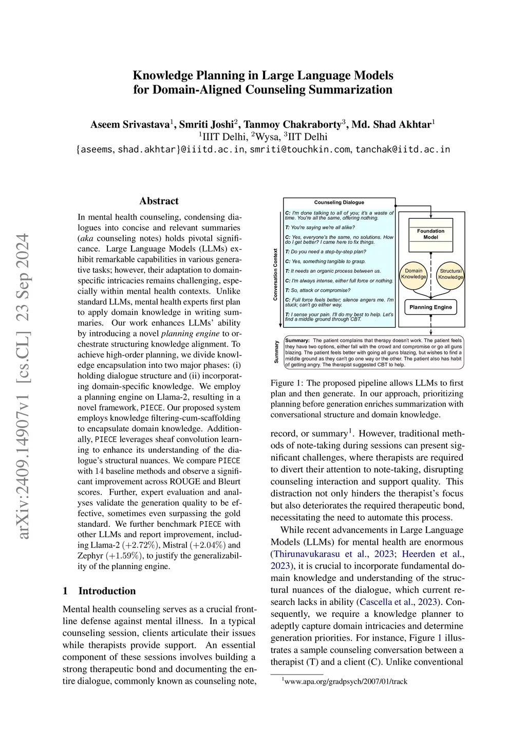 In mental health counseling, condensing dialogues into concise and relevant summaries (aka counseling notes) holds pivotal significance. Large Language Models (LLMs) exhibit remarkable capabilities in various generative tasks; however, their adaptation to domain-specific intricacies remains challenging, especially within mental health contexts. Unlike standard LLMs, mental health experts first plan to apply domain knowledge in writing summaries. Our work enhances LLMs' ability by introducing a novel planning engine to orchestrate structuring knowledge alignment. To achieve high-order planning, we divide knowledge encapsulation into two major phases: (i) holding dialogue structure and (ii) incorporating domain-specific knowledge. We employ a planning engine on Llama-2, resulting in a novel framework, PIECE. Our proposed system employs knowledge filtering-cum-scaffolding to encapsulate domain knowledge. Additionally, PIECE leverages sheaf convolution learning to enhance its understanding of the dialogue's structural nuances. We compare PIECE with 14 baseline methods and observe a significant improvement across ROUGE and Bleurt scores. Further, expert evaluation and analyses validate the generation quality to be effective, sometimes even surpassing the gold standard. We further benchmark PIECE with other LLMs and report improvement, including Llama-2 (+2.72%), Mistral (+2.04%), and Zephyr (+1.59%), to justify the generalizability of the planning engine.