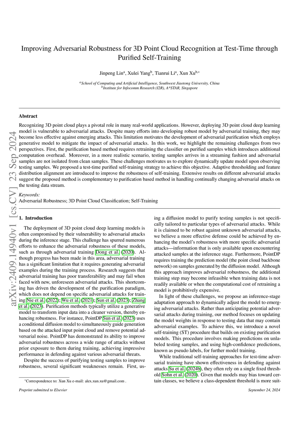 Recognizing 3D point cloud plays a pivotal role in many real-world applications. However, deploying 3D point cloud deep learning model is vulnerable to adversarial attacks. Despite many efforts into developing robust model by adversarial training, they may become less effective against emerging attacks. This limitation motivates the development of adversarial purification which employs generative model to mitigate the impact of adversarial attacks. In this work, we highlight the remaining challenges from two perspectives. First, the purification based method requires retraining the classifier on purified samples which introduces additional computation overhead. Moreover, in a more realistic scenario, testing samples arrives in a streaming fashion and adversarial samples are not isolated from clean samples. These challenges motivates us to explore dynamically update model upon observing testing samples. We proposed a test-time purified self-training strategy to achieve this objective. Adaptive thresholding and feature distribution alignment are introduced to improve the robustness of self-training. Extensive results on different adversarial attacks suggest the proposed method is complementary to purification based method in handling continually changing adversarial attacks on the testing data stream.