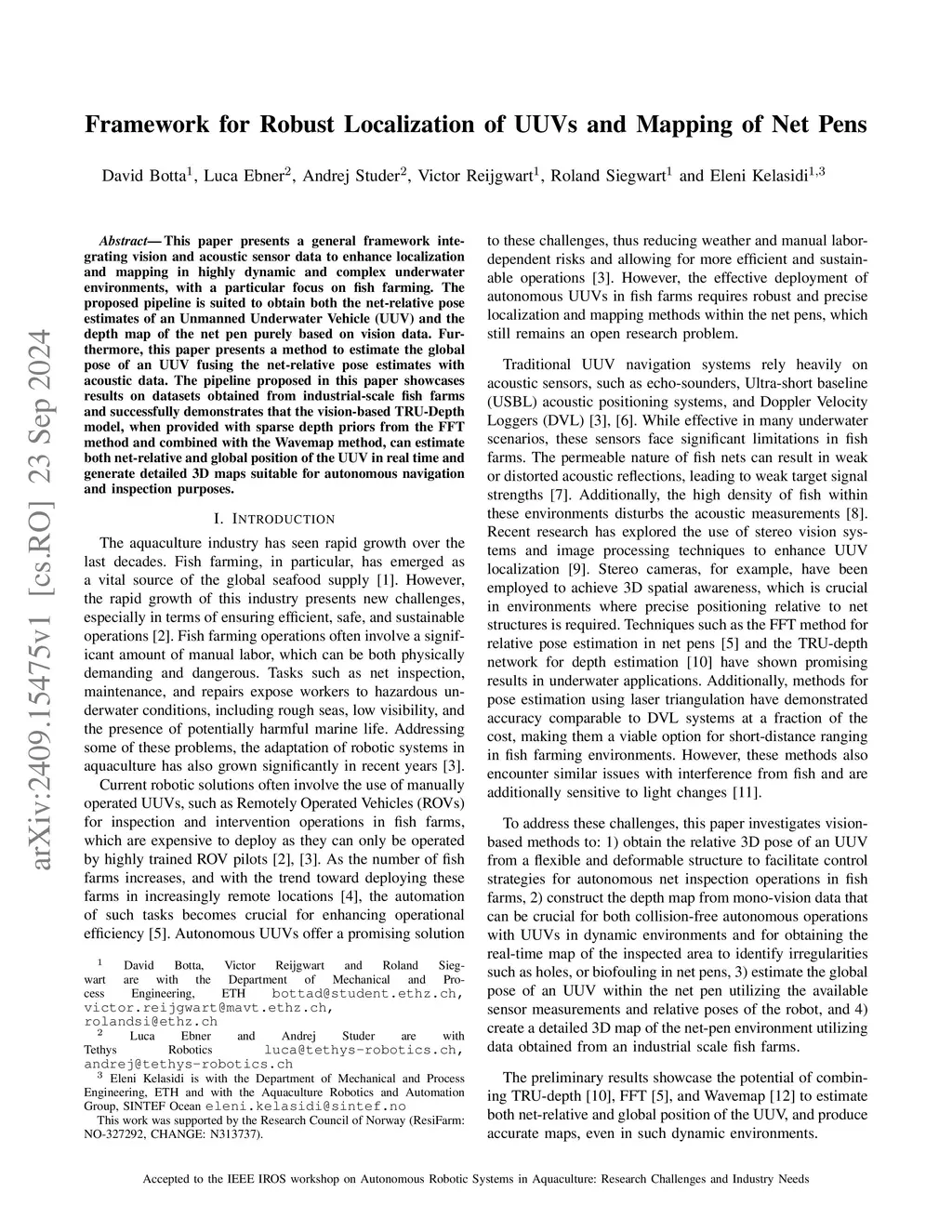 This paper presents a general framework integrating vision and acoustic sensor data to enhance localization and mapping in highly dynamic and complex underwater environments, with a particular focus on fish farming. The proposed pipeline is suited to obtain both the net-relative pose estimates of an Unmanned Underwater Vehicle (UUV) and the depth map of the net pen purely based on vision data. Furthermore, this paper presents a method to estimate the global pose of an UUV fusing the net-relative pose estimates with acoustic data. The pipeline proposed in this paper showcases results on datasets obtained from industrial-scale fish farms and successfully demonstrates that the vision-based TRU-Depth model, when provided with sparse depth priors from the FFT method and combined with the Wavemap method, can estimate both net-relative and global position of the UUV in real time and generate detailed 3D maps suitable for autonomous navigation and inspection purposes.