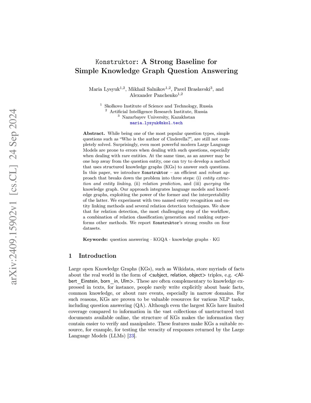 While being one of the most popular question types, simple questions such as "Who is the author of Cinderella?", are still not completely solved. Surprisingly, even the most powerful modern Large Language Models are prone to errors when dealing with such questions, especially when dealing with rare entities. At the same time, as an answer may be one hop away from the question entity, one can try to develop a method that uses structured knowledge graphs (KGs) to answer such questions. In this paper, we introduce Konstruktor - an efficient and robust approach that breaks down the problem into three steps: (i) entity extraction and entity linking, (ii) relation prediction, and (iii) querying the knowledge graph. Our approach integrates language models and knowledge graphs, exploiting the power of the former and the interpretability of the latter. We experiment with two named entity recognition and entity linking methods and several relation detection techniques. We show that for relation detection, the most challenging step of the workflow, a combination of relation classification/generation and ranking outperforms other methods. We report Konstruktor's strong results on four datasets.