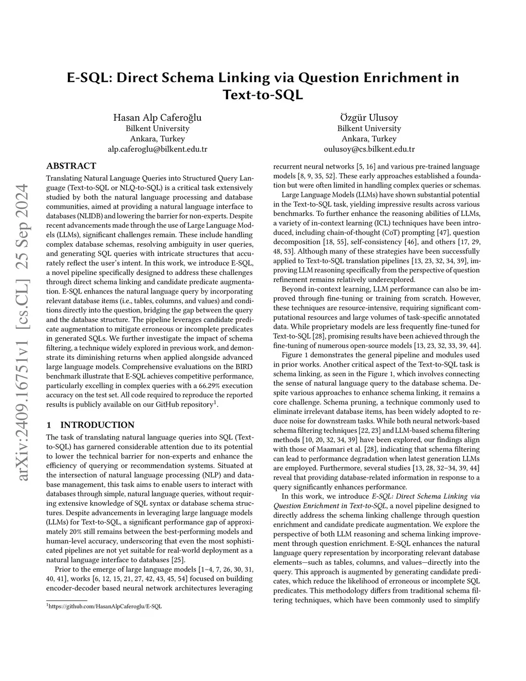 Translating Natural Language Queries into Structured Query Language (Text-to-SQL or NLQ-to-SQL) is a critical task extensively studied by both the natural language processing and database communities, aimed at providing a natural language interface to databases (NLIDB) and lowering the barrier for non-experts. Despite recent advancements made through the use of Large Language Models (LLMs), significant challenges remain. These include handling complex database schemas, resolving ambiguity in user queries, and generating SQL queries with intricate structures that accurately reflect the user's intent. In this work, we introduce E-SQL, a novel pipeline specifically designed to address these challenges through direct schema linking and candidate predicate augmentation. E-SQL enhances the natural language query by incorporating relevant database items (i.e., tables, columns, and values) and conditions directly into the question and SQL construction plan, bridging the gap between the query and the database structure. The pipeline leverages candidate predicate augmentation to mitigate erroneous or incomplete predicates in generated SQLs. Comprehensive evaluations on the BIRD benchmark illustrate that E-SQL achieves competitive performance, particularly excelling in complex queries with a 66.29% execution accuracy on the test set. A further observation from our experiments reveals that incorporating schema filtering into the translation pipeline does not have a positive impact on performance when the most advanced proprietary LLMs are used. Additionally, our experiments with small LLMs highlight the importance and positive impact of enriched questions on their performance. Without fine-tuning, single-prompt SQL generation using enriched questions with DeepSeek Coder 7B Instruct 1.5v achieves 56.45% execution accuracy on the BIRD development set.