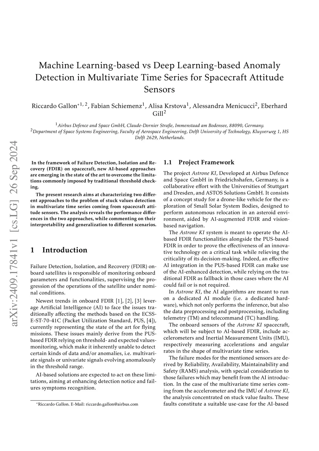 In the framework of Failure Detection, Isolation and Recovery (FDIR) on spacecraft, new AI-based approaches are emerging in the state of the art to overcome the limitations commonly imposed by traditional threshold checking. The present research aims at characterizing two different approaches to the problem of stuck values detection in multivariate time series coming from spacecraft attitude sensors. The analysis reveals the performance differences in the two approaches, while commenting on their interpretability and generalization to different scenarios.