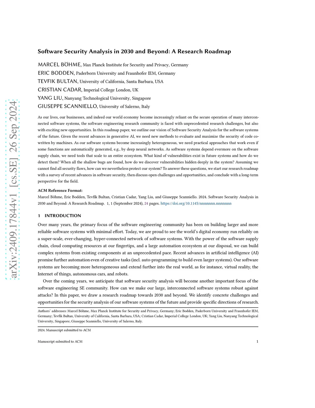 As our lives, our businesses, and indeed our world economy become increasingly reliant on the secure operation of many interconnected software systems, the software engineering research community is faced with unprecedented research challenges, but also with exciting new opportunities. In this roadmap paper, we outline our vision of Software Security Analysis for the software systems of the future. Given the recent advances in generative AI, we need new methods to evaluate and maximize the security of code co-written by machines. As our software systems become increasingly heterogeneous, we need practical approaches that work even if some functions are automatically generated, e.g., by deep neural networks. As software systems depend evermore on the software supply chain, we need tools that scale to an entire ecosystem. What kind of vulnerabilities exist in future systems and how do we detect them? When all the shallow bugs are found, how do we discover vulnerabilities hidden deeply in the system? Assuming we cannot find all security flaws, how can we nevertheless protect our system? To answer these questions, we start our research roadmap with a survey of recent advances in software security, then discuss open challenges and opportunities, and conclude with a long-term perspective for the field.