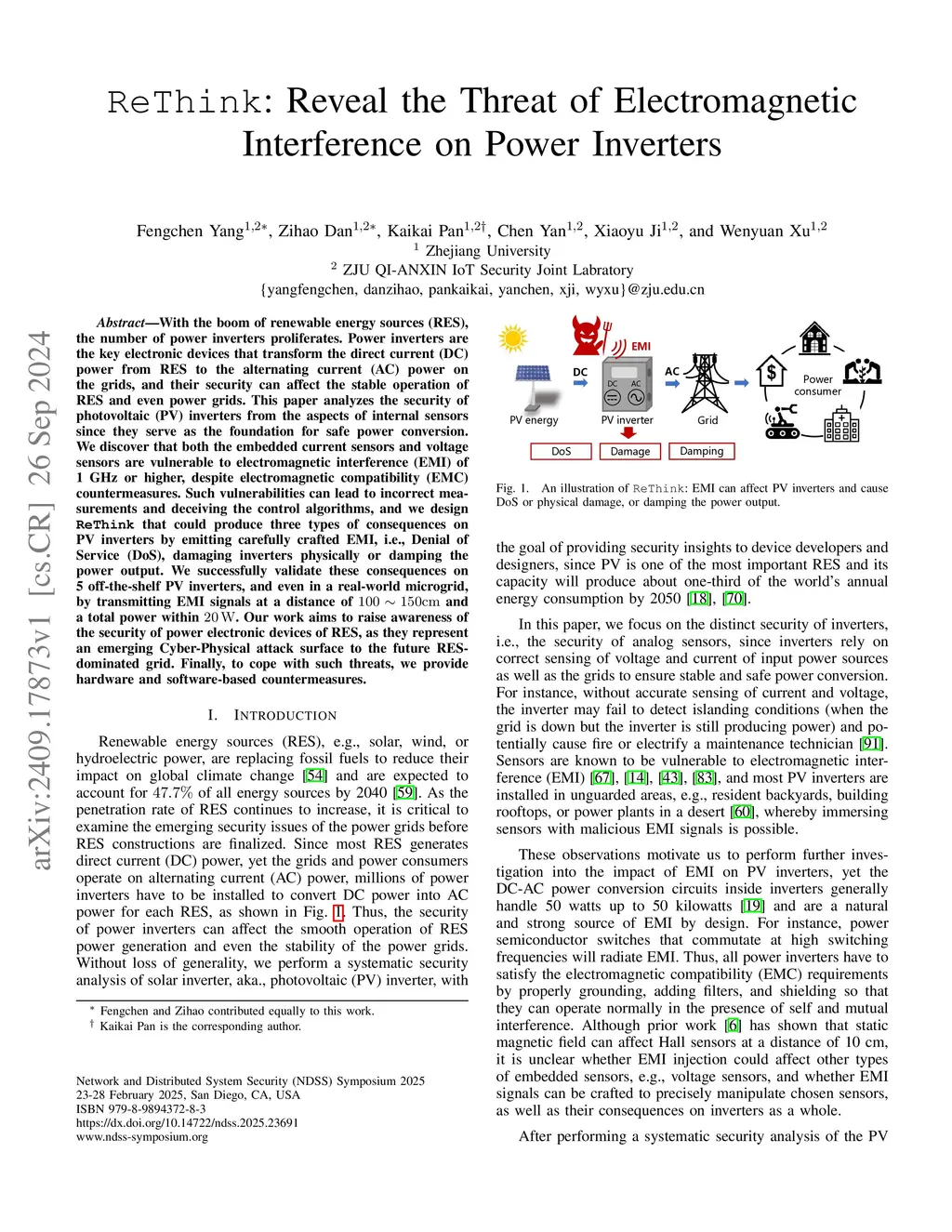 With the boom of renewable energy sources (RES), the number of power inverters proliferates. Power inverters are the key electronic devices that transform the direct current (DC) power from RES to the alternating current (AC) power on the grids, and their security can affect the stable operation of RES and even power grids. This paper analyzes the security of photovoltaic (PV) inverters from the aspects of internal sensors since they serve as the foundation for safe power conversion. We discover that both the embedded current sensors and voltage sensors are vulnerable to electromagnetic interference (EMI) of 1 GHz or higher, despite electromagnetic compatibility (EMC) countermeasures. Such vulnerabilities can lead to incorrect measurements and deceiving the control algorithms, and we design ReThink that could produce three types of consequences on PV inverters by emitting carefully crafted EMI, i.e., Denial of Service (DoS), damaging inverters physically or damping the power output. We successfully validate these consequences on 5 off-the-shelf PV inverters, and even in a real-world microgrid, by transmitting EMI signals at a distance of 100-150cm and a total power within 20W. Our work aims to raise awareness of the security of power electronic devices of RES, as they represent an emerging Cyber-Physical attack surface to the future RES-dominated grid. Finally, to cope with such threats, we provide hardware and software-based countermeasures.