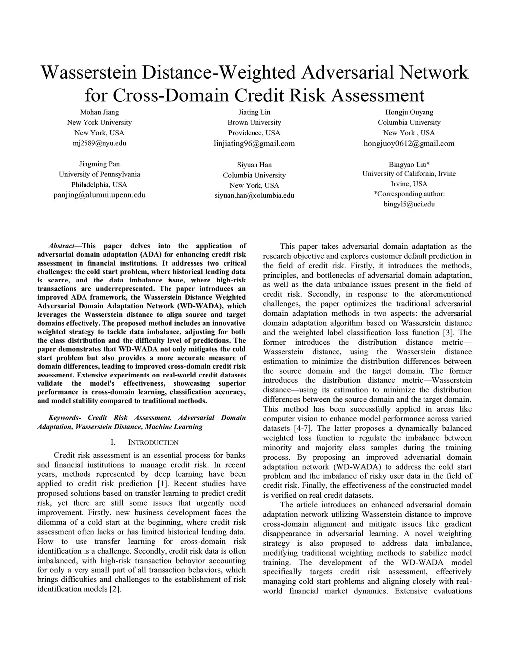 This paper delves into the application of adversarial domain adaptation (ADA) for enhancing credit risk assessment in financial institutions. It addresses two critical challenges: the cold start problem, where historical lending data is scarce, and the data imbalance issue, where high-risk transactions are underrepresented. The paper introduces an improved ADA framework, the Wasserstein Distance Weighted Adversarial Domain Adaptation Network (WD-WADA), which leverages the Wasserstein distance to align source and target domains effectively. The proposed method includes an innovative weighted strategy to tackle data imbalance, adjusting for both the class distribution and the difficulty level of predictions. The paper demonstrates that WD-WADA not only mitigates the cold start problem but also provides a more accurate measure of domain differences, leading to improved cross-domain credit risk assessment. Extensive experiments on real-world credit datasets validate the model's effectiveness, showcasing superior performance in cross-domain learning, classification accuracy, and model stability compared to traditional methods.