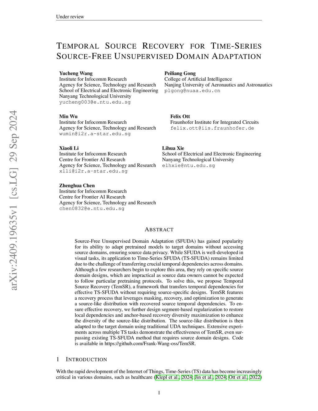 Temporal Source Recovery for Time-Series Source-Free Unsupervised Domain Adaptation