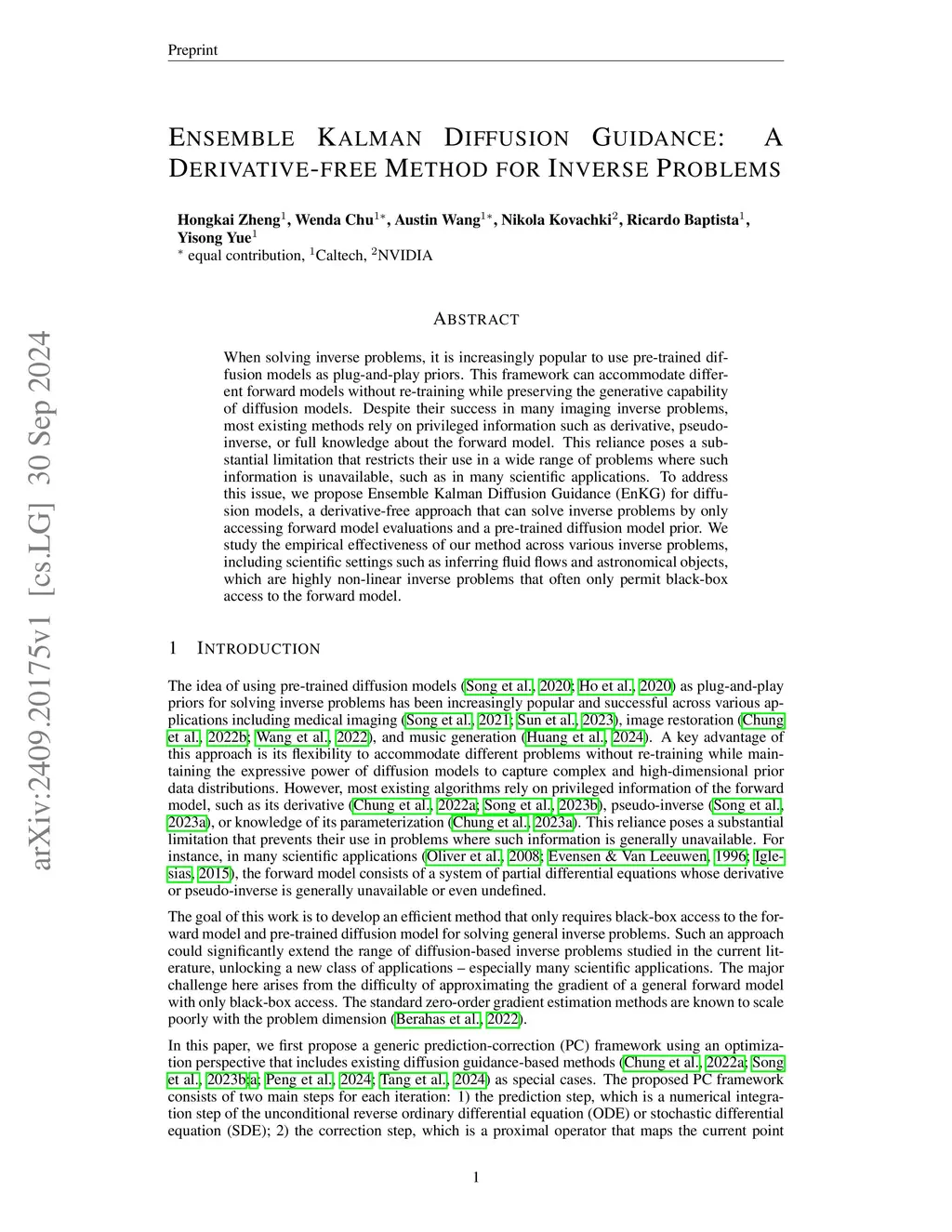 When solving inverse problems, one increasingly popular approach is to use pre-trained diffusion models as plug-and-play priors. This framework can accommodate different forward models without re-training while preserving the generative capability of diffusion models. Despite their success in many imaging inverse problems, most existing methods rely on privileged information such as derivative, pseudo-inverse, or full knowledge about the forward model. This reliance poses a substantial limitation that restricts their use in a wide range of problems where such information is unavailable, such as in many scientific applications. We propose Ensemble Kalman Diffusion Guidance (EnKG), a derivative-free approach that can solve inverse problems by only accessing forward model evaluations and a pre-trained diffusion model prior. We study the empirical effectiveness of EnKG across various inverse problems, including scientific settings such as inferring fluid flows and astronomical objects, which are highly non-linear inverse problems that often only permit black-box access to the forward model. We open-source our code atthis https URL.