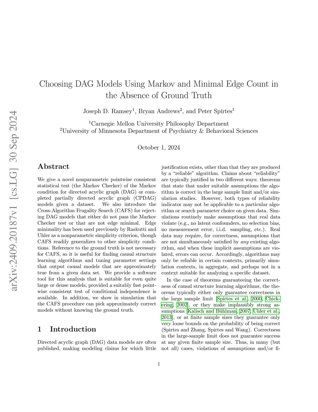 We give a novel nonparametric pointwise consistent statistical test (the Markov Checker) of the Markov condition for directed acyclic graph (DAG) or completed partially directed acyclic graph (CPDAG) models given a dataset. We also introduce the Cross-Algorithm Frugality Search (CAFS) for rejecting DAG models that either do not pass the Markov Checker test or that are not edge minimal. Edge minimality has been used previously by Raskutti and Uhler as a nonparametric simplicity criterion, though CAFS readily generalizes to other simplicity conditions. Reference to the ground truth is not necessary for CAFS, so it is useful for finding causal structure learning algorithms and tuning parameter settings that output causal models that are approximately true from a given data set. We provide a software tool for this analysis that is suitable for even quite large or dense models, provided a suitably fast pointwise consistent test of conditional independence is available. In addition, we show in simulation that the CAFS procedure can pick approximately correct models without knowing the ground truth.